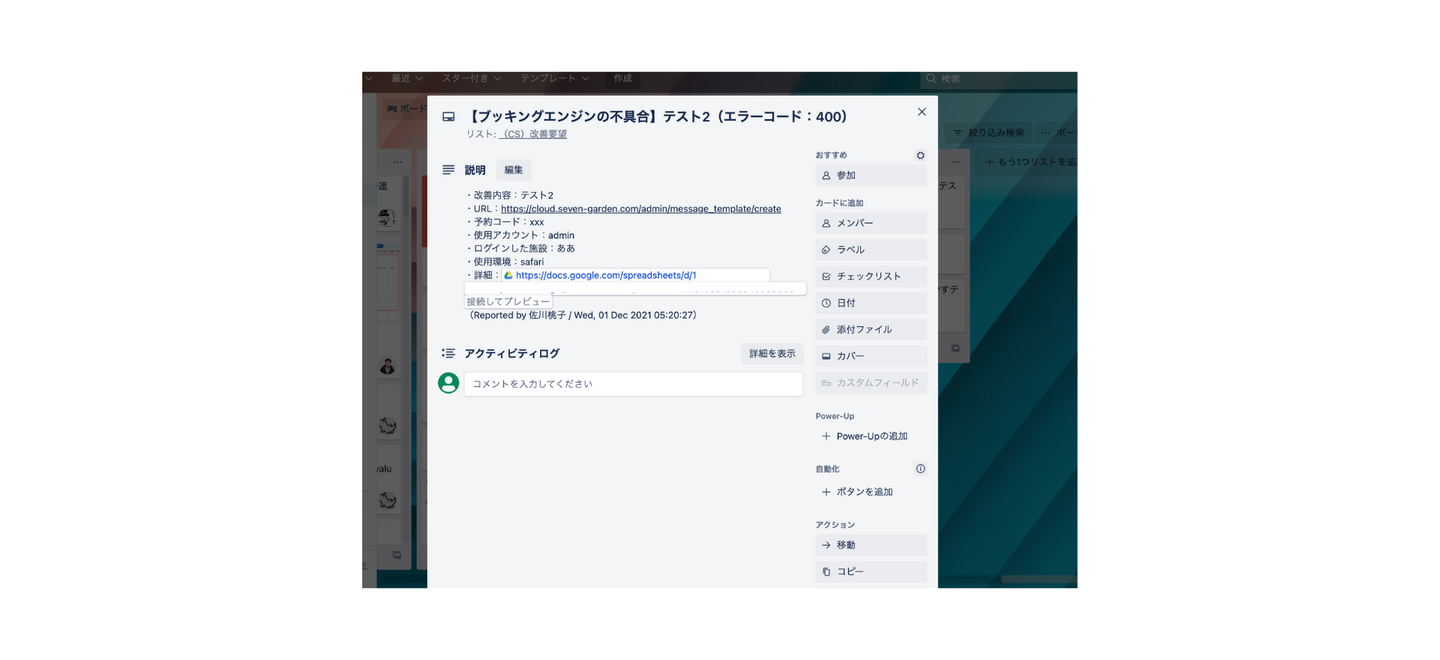 Slackで上げられた報告は自動的にスプレッドシートにストックされ、最終的にはエンジニアが使用しているタスク管理ツール「Trello」まで自動で連携されるように仕込みました。