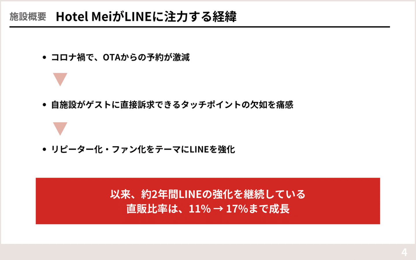 ホテルの集客は、Booking.comやExpedia、楽天トラベルやじゃらんなどOTA(Online Travel Agent)と呼ばれる予約ポータルサイトからの送客が多くの割合を占めます。これは顕在化した宿泊需要をポータルに集め、それを宿泊施設へ還元するモデルです。一方でコロナ禍では顕在化した宿泊需要など存在せず、一時的にではありますがOTAに人が集まることもなくなりました。そんな中で弊社は、施設がゲストに直接アプローチ可能なタッチポイントの構築を先送りにした課題を痛感しました。