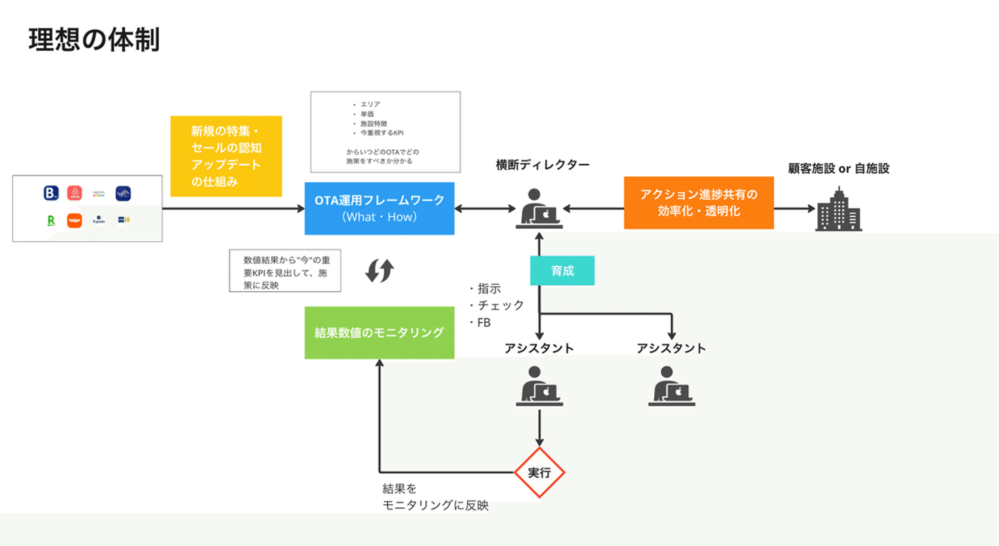 下記は完全に社内向けの資料ですが、構想ではマーケティングの日常業務はAIを中心に周り、ホテルマーケティング業務のウェイトは実務の遂行から、AIを活用した仕組みのアップデートに移行していく未来を構想しています。