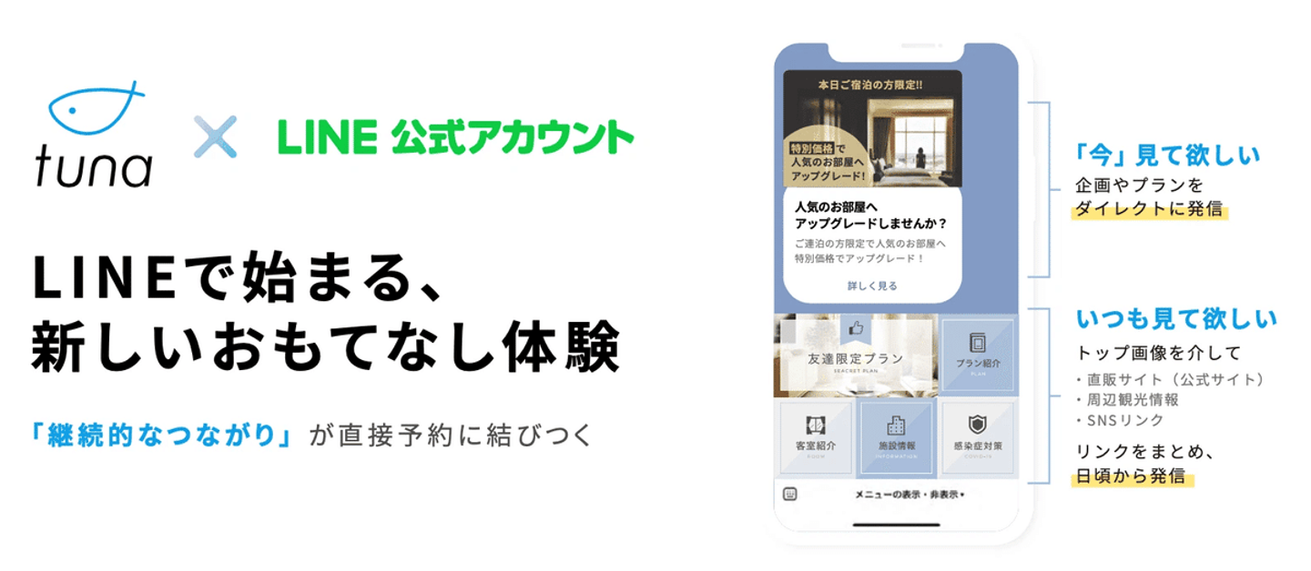 そしてLINE上で、宿泊施設の持つリッチな予約・顧客データを、滞在満足度の向上・滞在後のリピート促進に向け利活用可能な形を模索した結果生まれたのが「tuna」というプロダクトです。