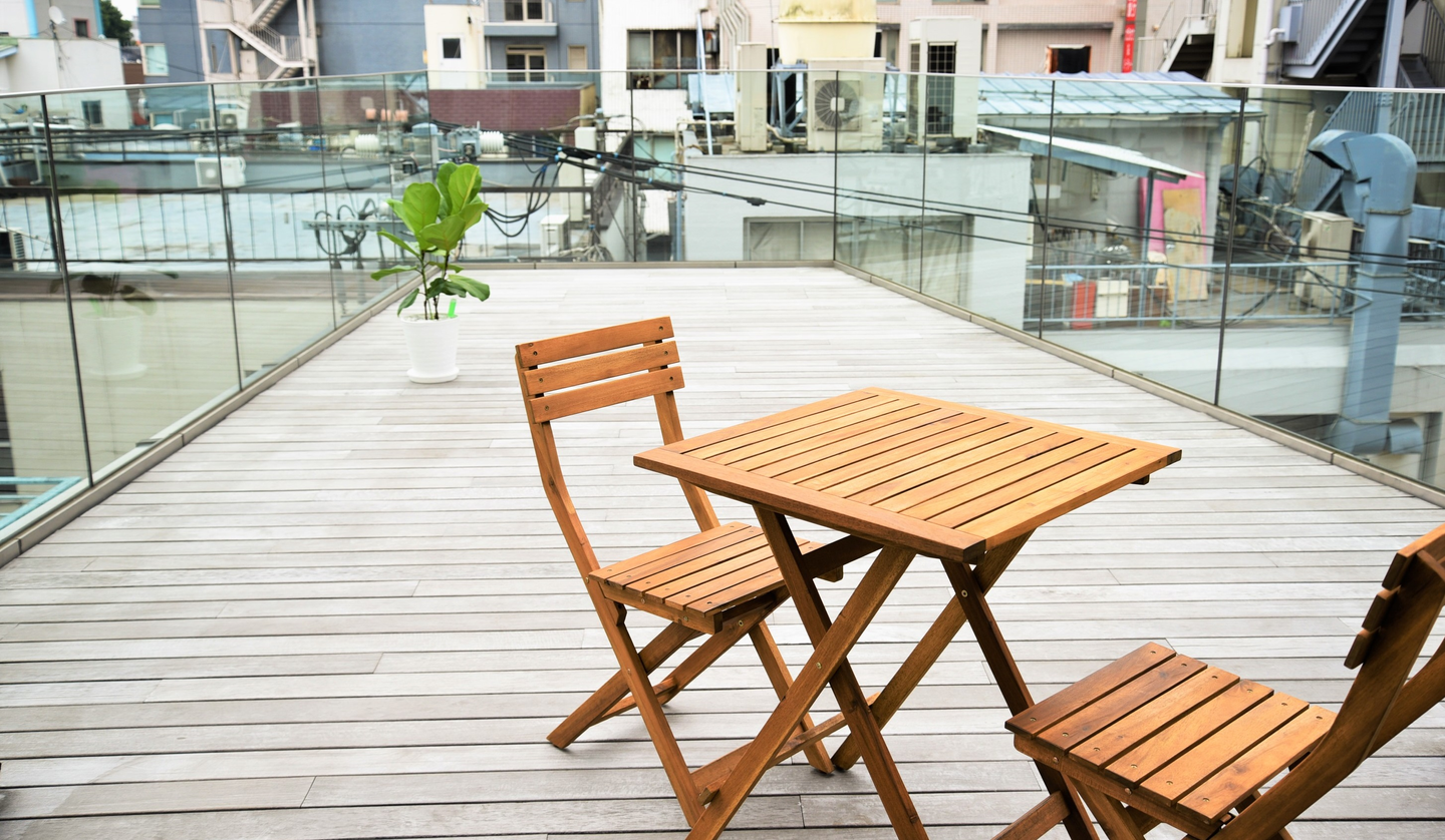 こちらは会社専用のテラスになります。晴れていれば此処で青空のもと仕事が出来ます。現在影となる天井がないため、今後パラソルなどを買って日陰空間を作りたいと思っています。外の空気を吸いながら仕事したい方や、小休憩したい方専用。