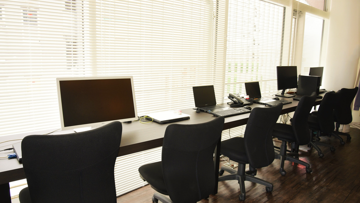 窓側の作業デスクです。目の前もビルが並んでいるので常にブラインドを開けてはおけませんが、程よい日差しがオフィス内に届いています。