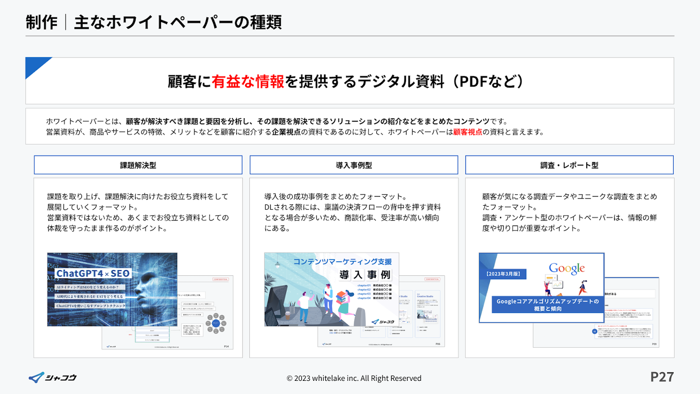シャコウの場合は、BtoB事業を展開するクライアントの”お客様との接点”を作るための資料や記事を制作することが主な業務となります。