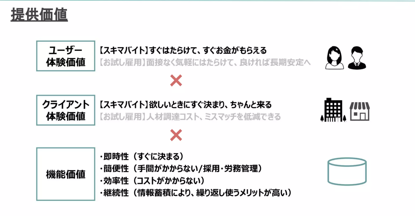 1日単位からのマッチングの受け入れスキームの構築や即払いという特殊な体型、また面接なしによるマッチングスキームの構築などの参入障壁の高さから国内のプレイヤー企業が数社に絞られる状態の中で、トップシェア獲得を目指して事業を伸ばしています。