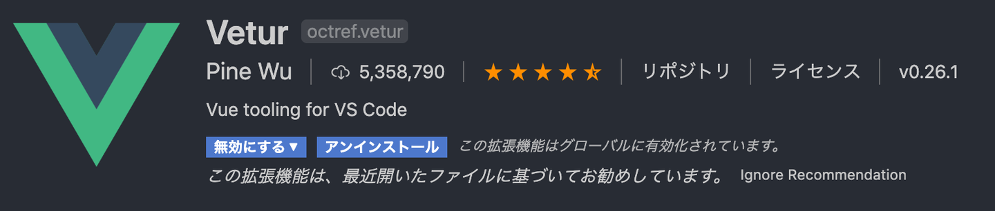 VSCodeを知らない人は少ないと思いますので、ここではインストール方法などは割愛しますが、Vue.jsを書くにあたって機能拡張で「vetur」と「prettier」あたりを入れておくと良いでしょう。シンタックスハイライトや規約に沿ったESLintのフォーマットに自動でしてくれます。