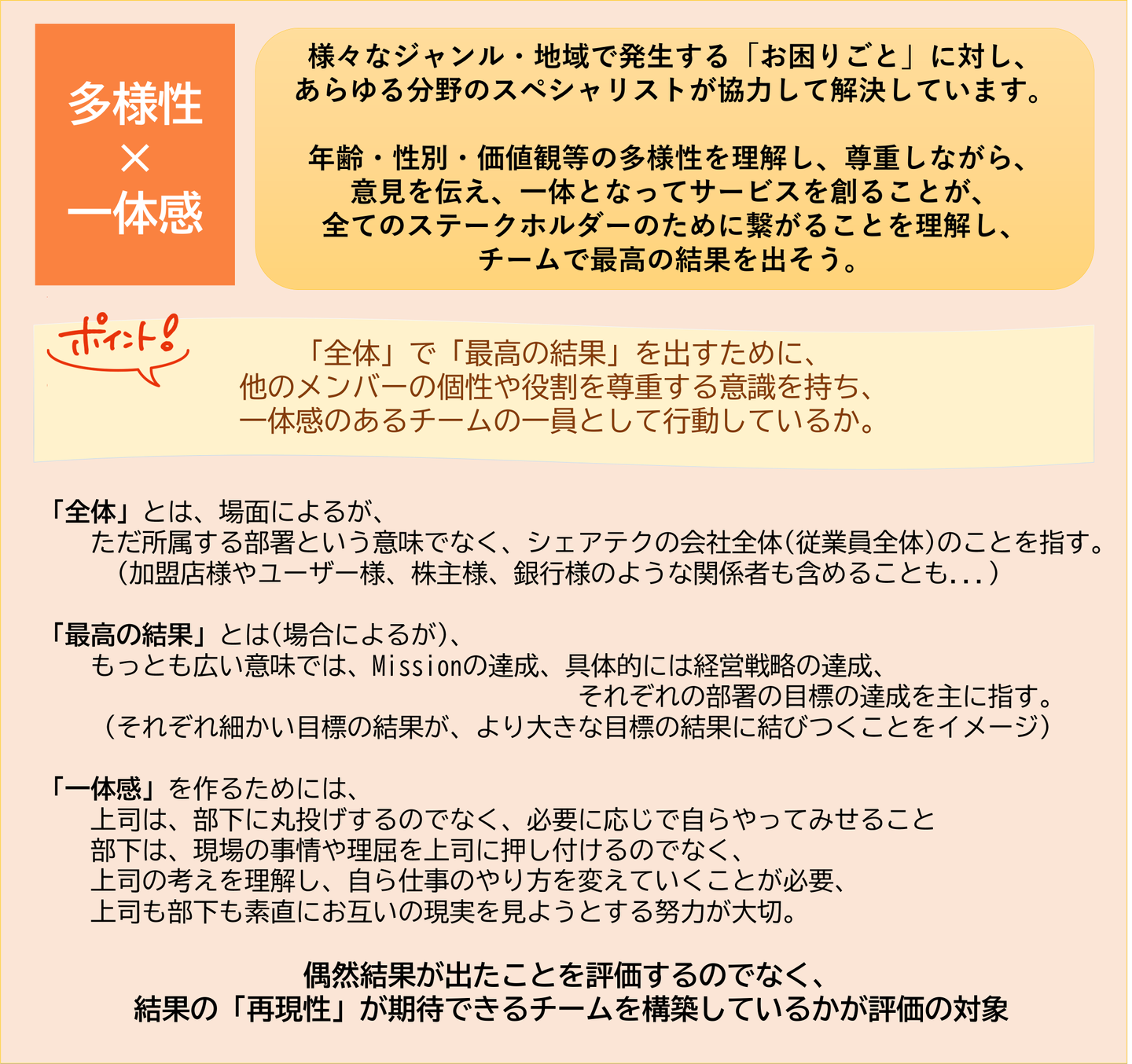 制度設計という観点では、マネジメント層からスタッフ層まで全員がバリューの3項目で評価をする仕組みにしています。それぞれの役割レベル(課長レベル、リーダーレベルなど)に応じて、バリューに沿った行動をしてくれていたかどうかを半年に1回評価して、昇降格や賃金改定に反映するようにしています。
