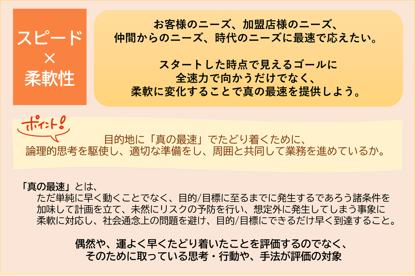 単純に「スピード」という言葉を捉えて、何でも速くやることが良いこととなって、結果質が悪い仕事では意味がなくなってしまうので、このように解釈を明文化することは重要と考えています。