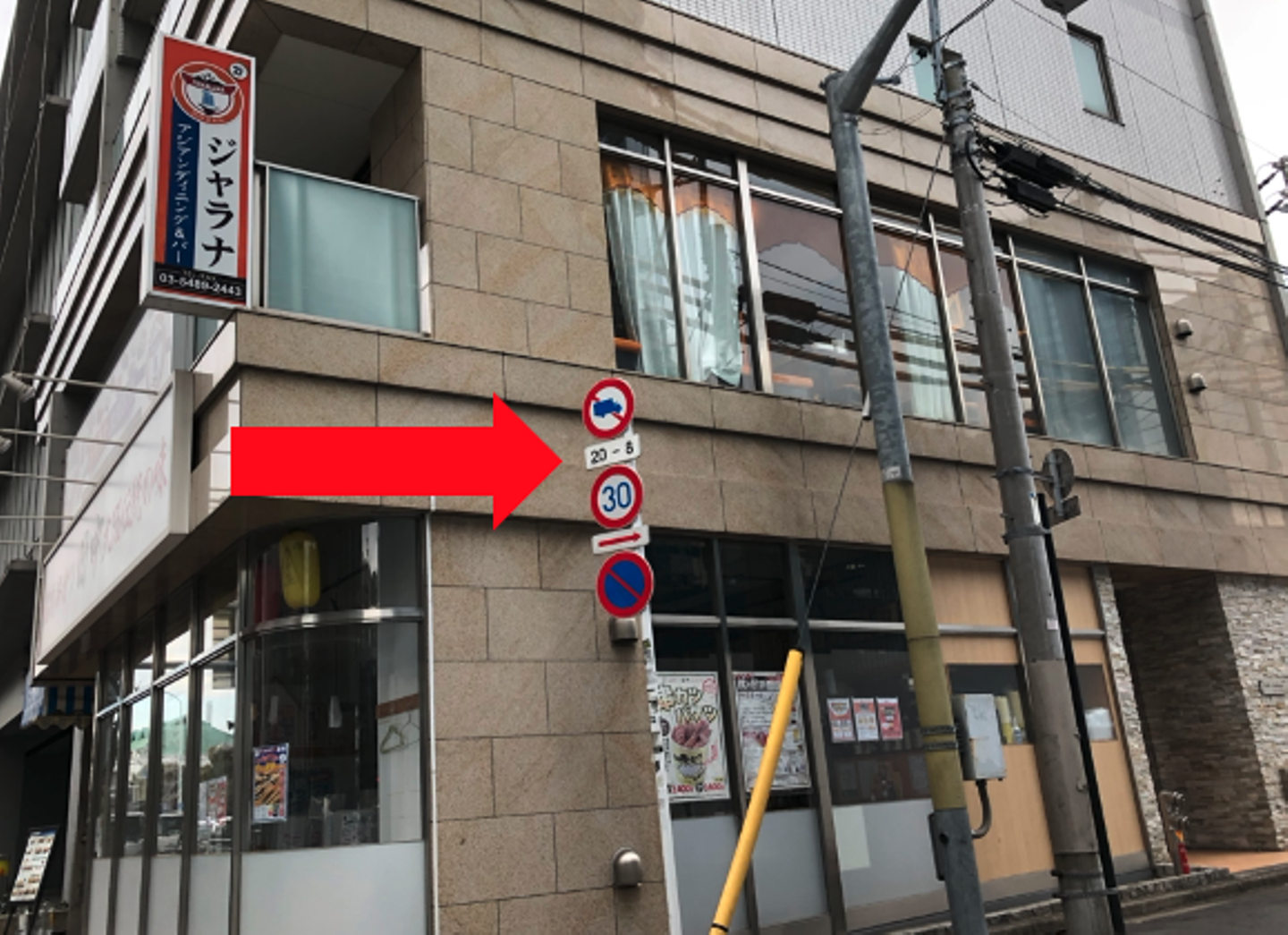 目の前に1階が串カツ田中、2階にジャラナというアジアン料理屋の入っているビルがみえます。
