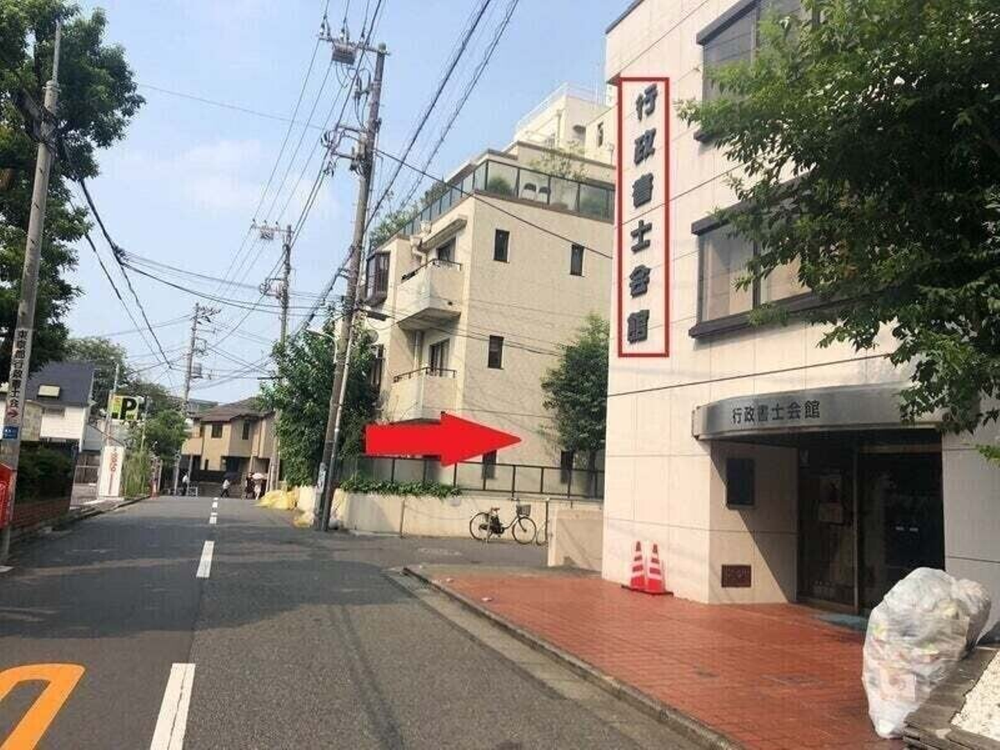 少し進むと、右手に「行政書士会館」がみえます。その角で右折してください。