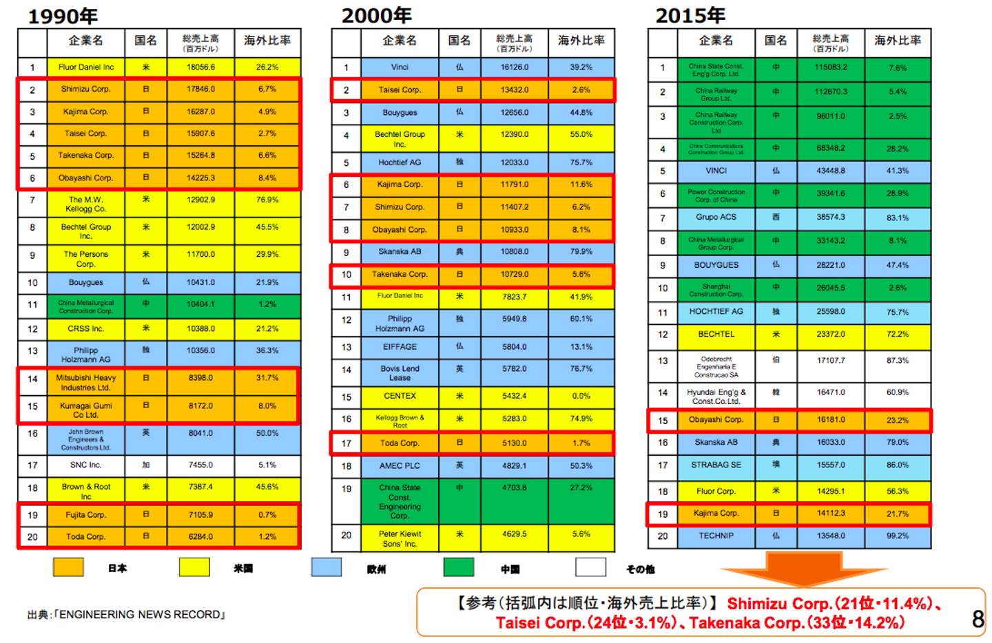海外売上比率の変遷を見ると、海外には総売上のほとんどが海外売上高である企業も存在します。日本はゼネコンを筆頭に1990年代に比べて少しずつ比率はアップしていますが、世界と比べるとまだまだ低い状況です。これはかつて国内に大きな需要があったことや、一時的な海外展開しか行われてこなかったことが原因です。