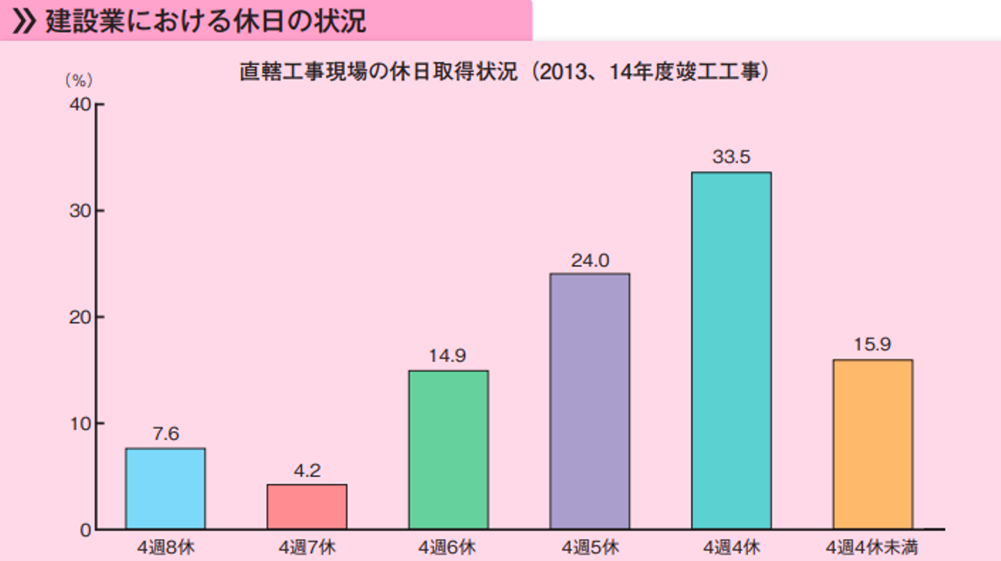 一つは、現場で働く人は日給制の人が多く、勤務日数を減らすと彼らの手取りが少なくなるからです。もう一つは、週休二日制を取り入れると工期が延び、工費が上がってしまうのを発注者が良しとしないからです。
