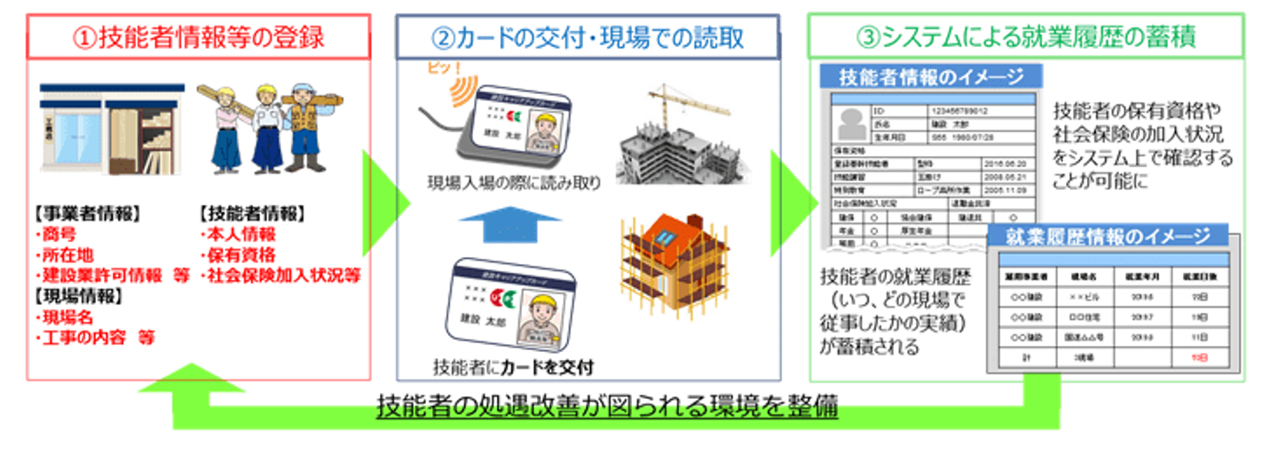 これは国土交通省が提唱した「技能者に配布するICカードを通じて技能者の現場における就業履歴や保有資格などを統一のルールでシステムに蓄積する」システムで、技能者の基本情報や社会保険加入状況、保有資格、就業履歴、事業者情報が登録されます。