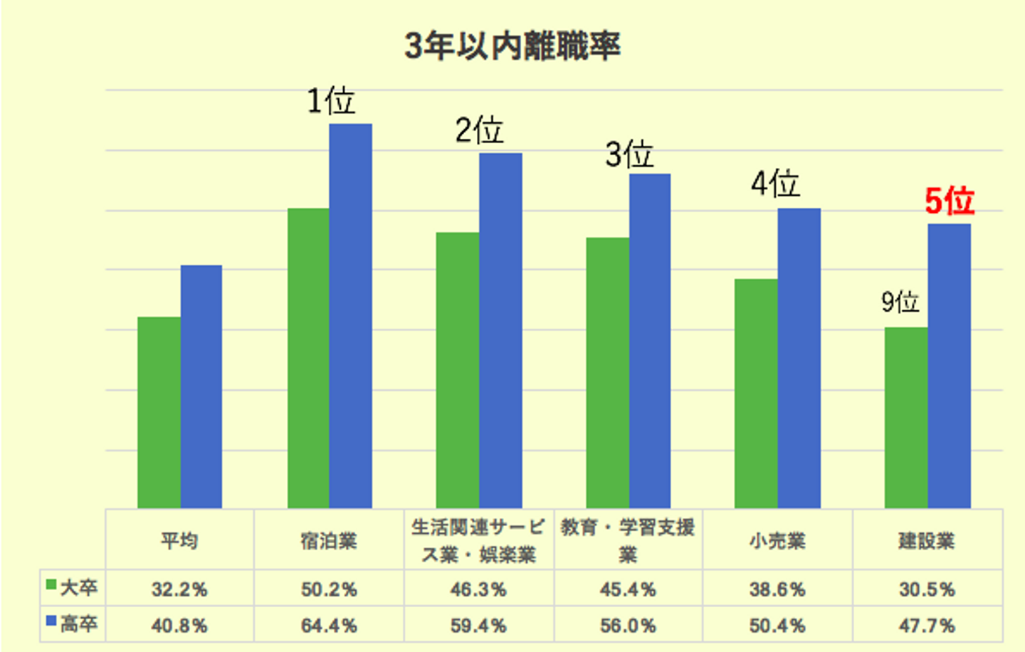 また建設業就業者は大卒の3年以内離職率は30.5%と全産業の中でも上位にランクインし、高卒の離職率も47.7%と平均値を大幅に超え、5位になっています。このまま行けば建設業界は将来、さらに深刻な人手不足に陥いるとみられています。このような状況になっているのは主に3つの原因があります。