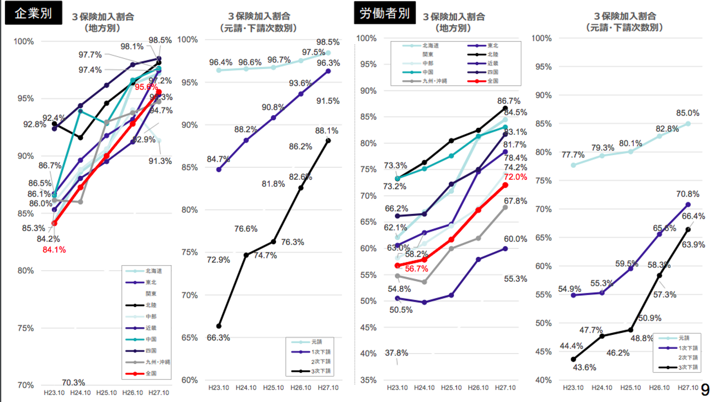 公共事業労務費調査における保険加入状況を見ると、全体的に加入状況は上昇傾向にありますが、地方より関東が、元請け企業より高次下請け企業が加入率の低い傾向にあります。危険を伴う仕事が多い業界にも関わらず、保険に入っていない人が多いのが現状です。これは保険料が高額であること、誰がどの保険に入っているのか管理するシステムが整っていないことが主な原因です。