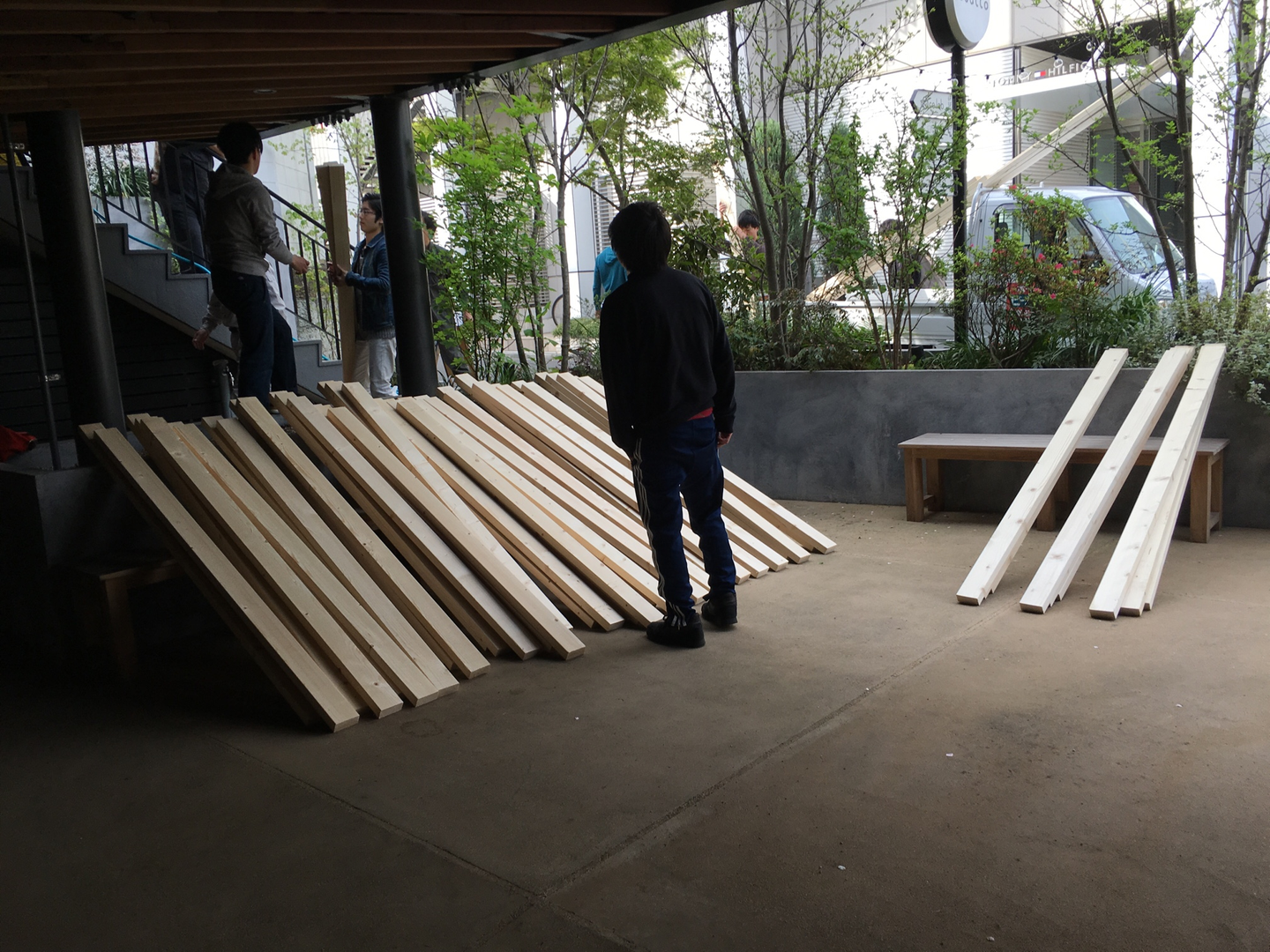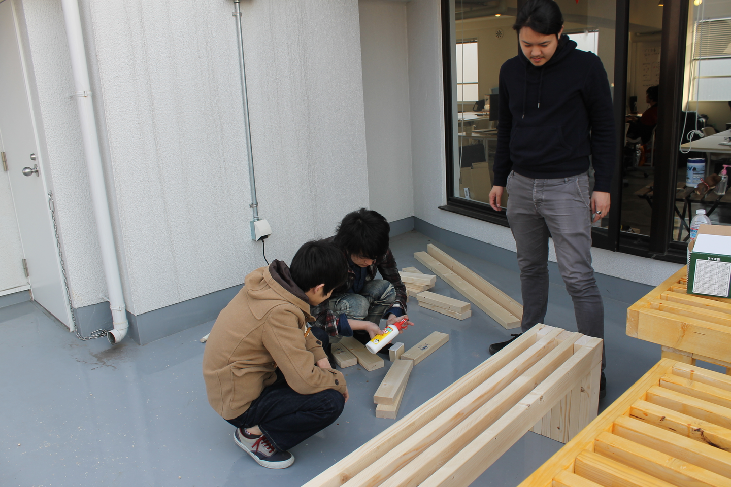 その横では週末のテーブル作りに参加できなかったメンバーが中心になって、ベンチ制作を進めます。