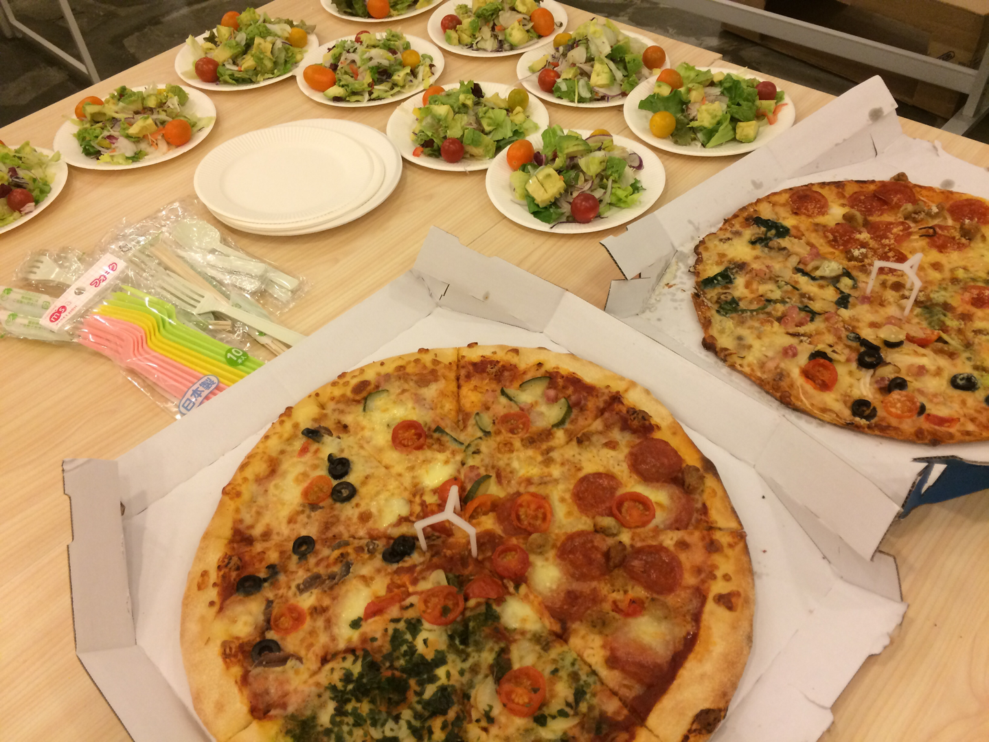 ④休憩。長期戦になってきたので、宅配ピザ&サラダで休憩。