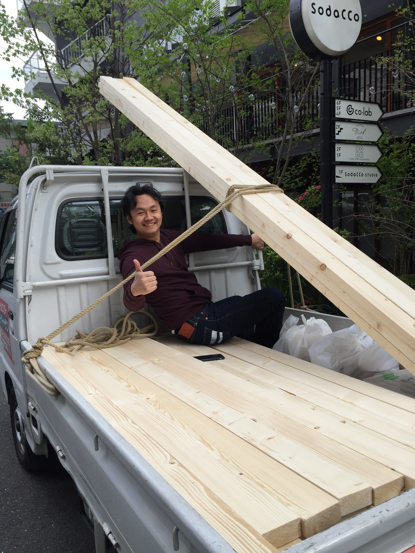 ①買った木材の運び込み。ホームセンターで借りたトラックで運び込みます。