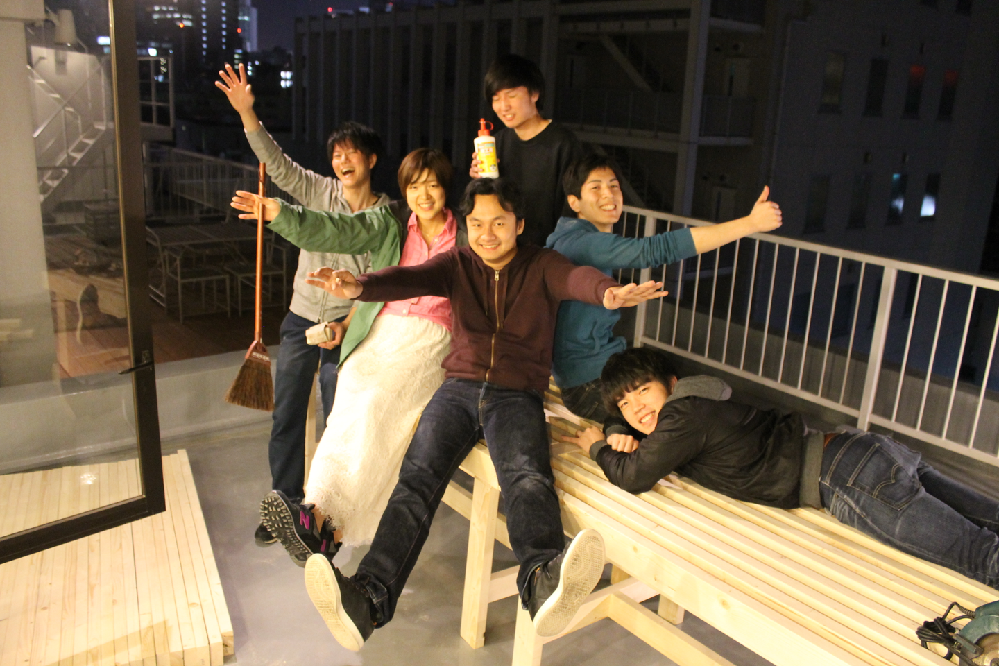 テーブル×2、ベンチ×5が完成。ほぼ石川の設計図通りにできました!