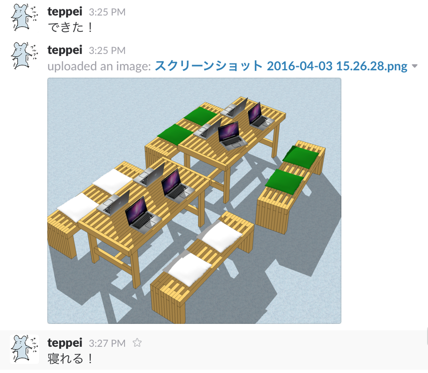 現在はWEBデザインが主ですが、元々空間デザインを仕事でもしていた石川に、代表の呂が無茶振りで設計を依頼したところ、ある週末社内チャットのslackにこんなポストが!!