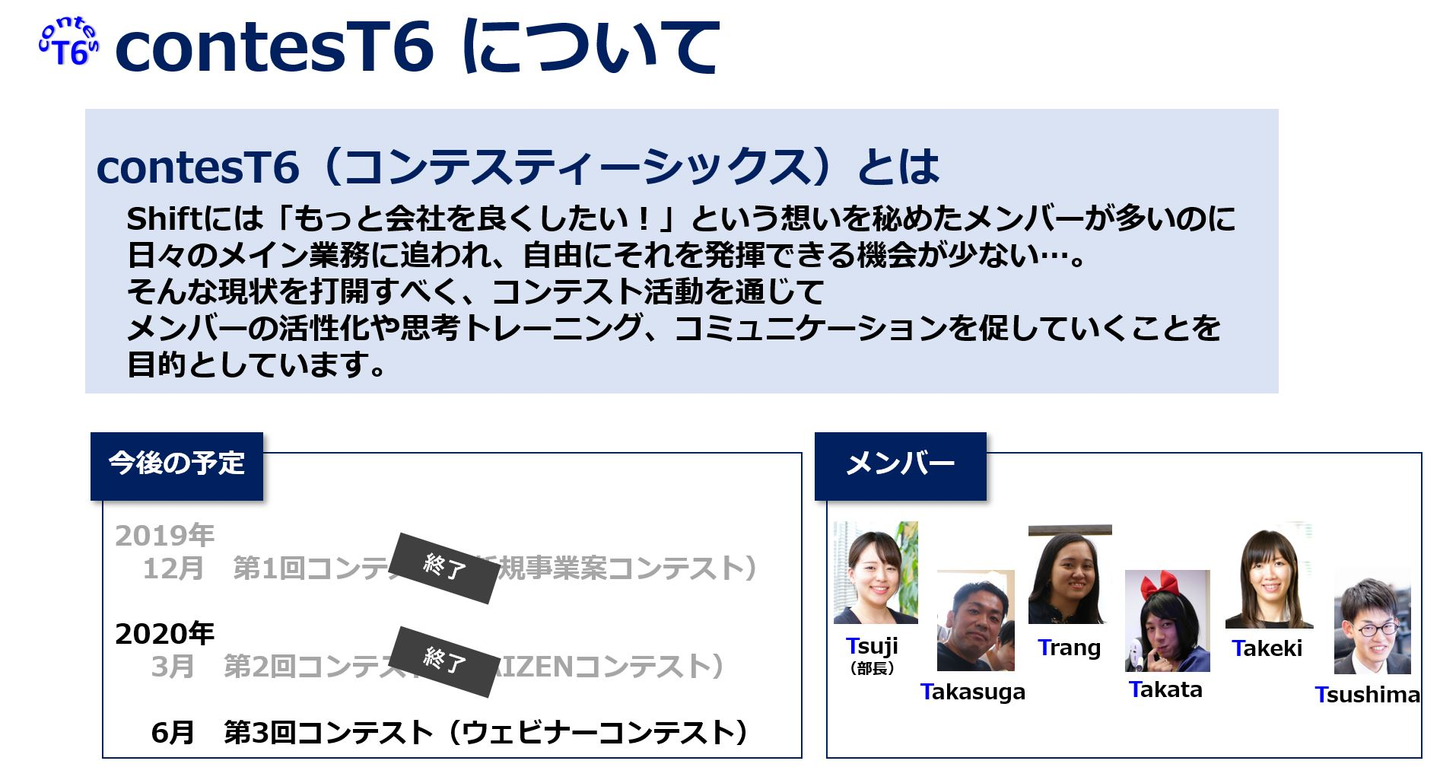 Tags: 社内イベント 皆さんこんにちは。 最近記事を書くことが増えてきました 新卒1年目 對馬です! 今日は、 12月24日に開かれた "Shift 第1回新規事業案コンテスト" を特集します! Shiftメンバーの特徴といえば... チャレンジ精神を秘めたメンバーがとにかく多い! でも、日々のメイン業務に追われることも多く、 新しいことにチャレンジしたいと思っても、なかなか自由に発揮できる機会が少ないことが惜しいポイントでした。 そこで、立ち上がったのが contesT6(コンテスティSix)!!
