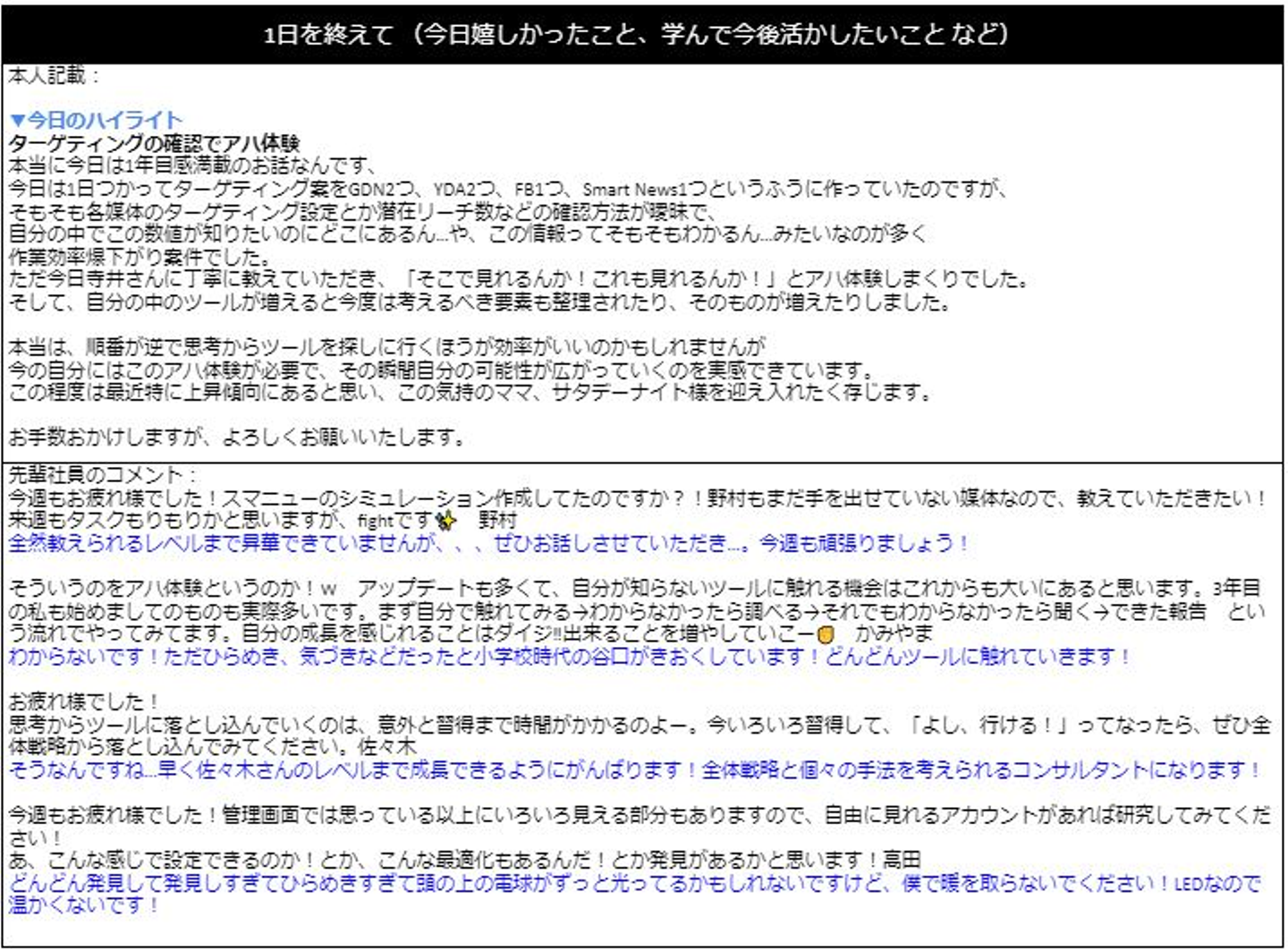 タスクとスケジュール以外に、「1日を終えて‥」の記載欄は今日の学びや気づきを自分なりの言葉でアウトプットしてもらいます。さらには、毎日先輩社員からアドバイスなどが書き込まれるため、仕事の進め方のヒントになったり励みになったりしている新人さんもいるようです✨