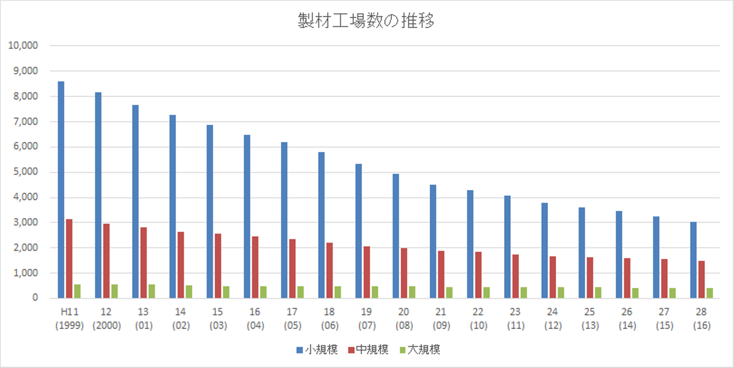 林野庁統計によると、小規模製材工場は年率6%のペースで減少しております。