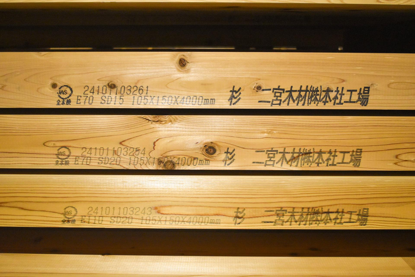 そして、二宮木材ではJAS機械等級区分構造用製材を生産しています(JAS材に関してはこちら)。