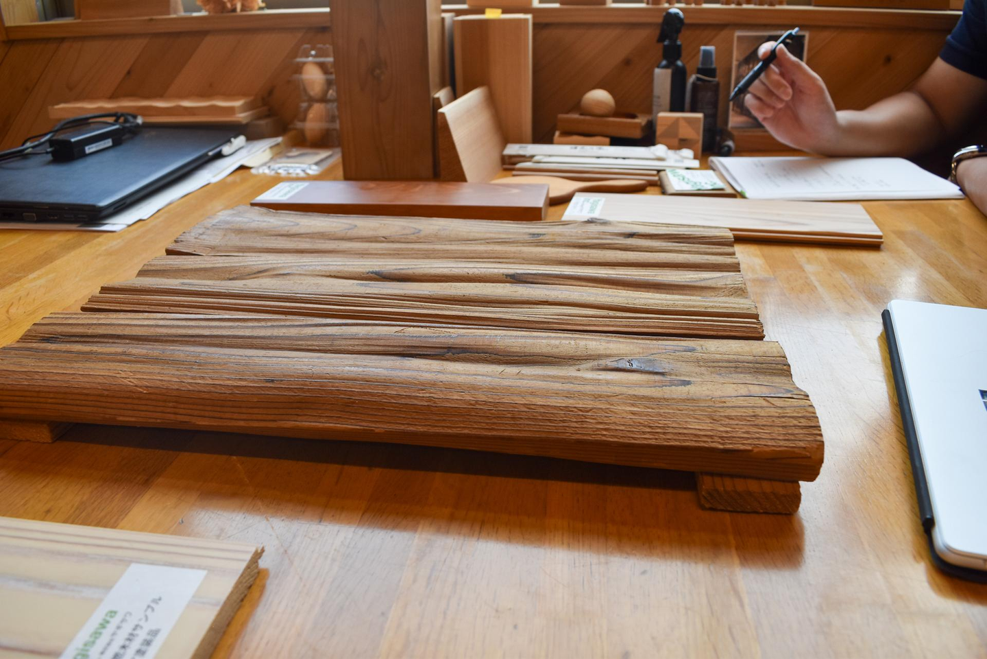 例えば、こちらの杉光(さんこう)Waveは、スギの高付加価値での活用を目指した製品で、独特の凹凸が特徴的です。