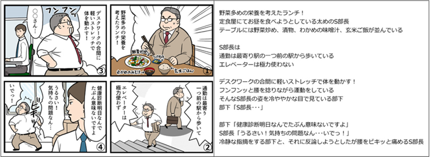 例えば1コマ目のように、椅子に座って食事をしようとしているS部長と