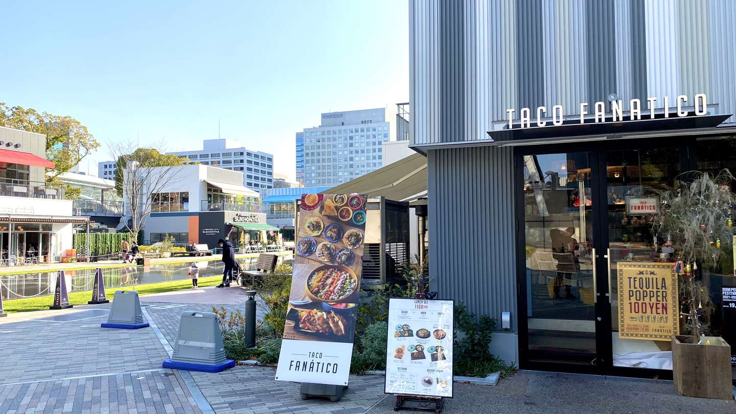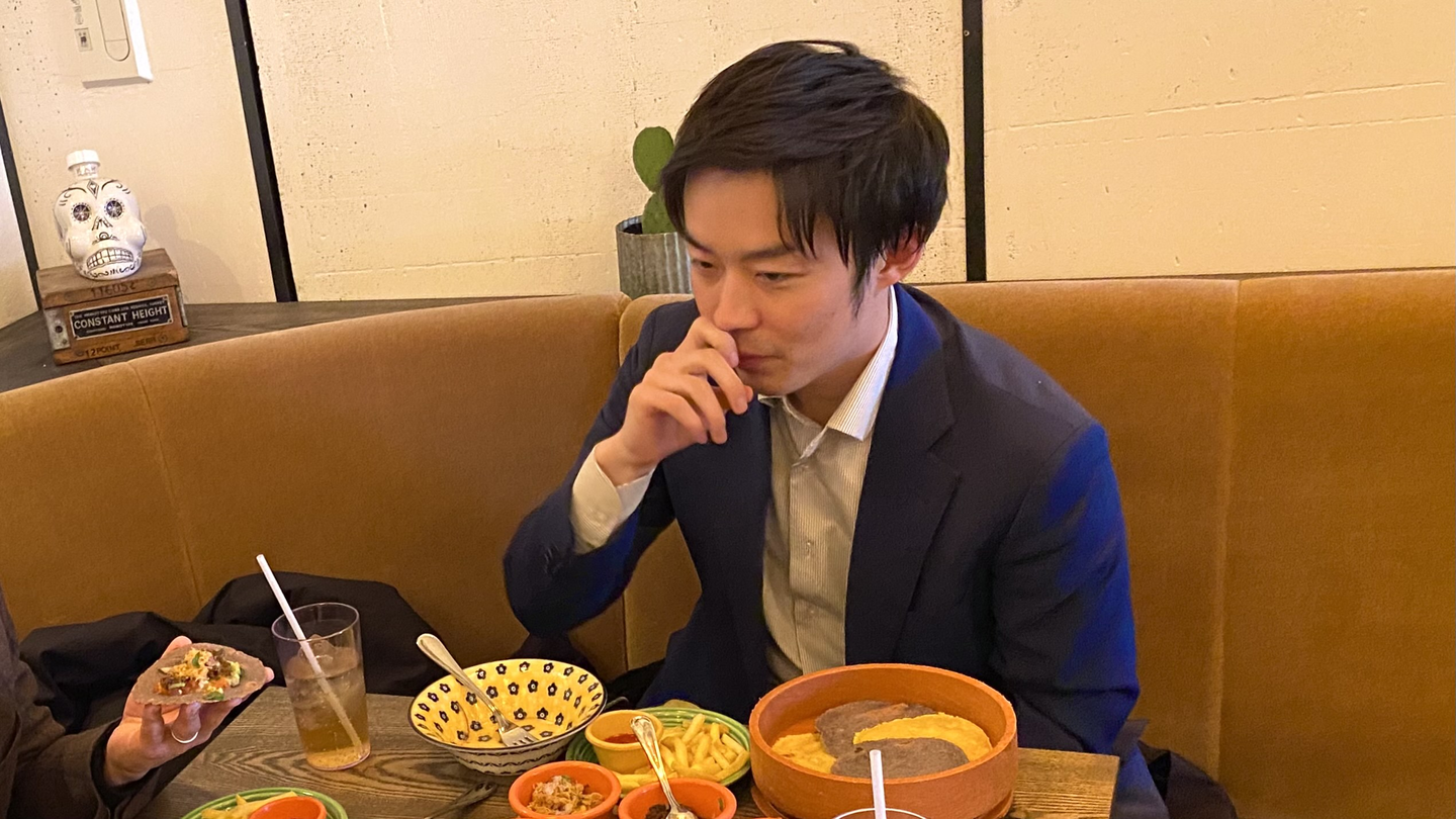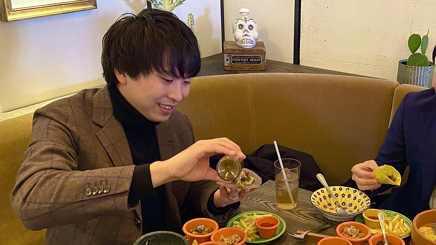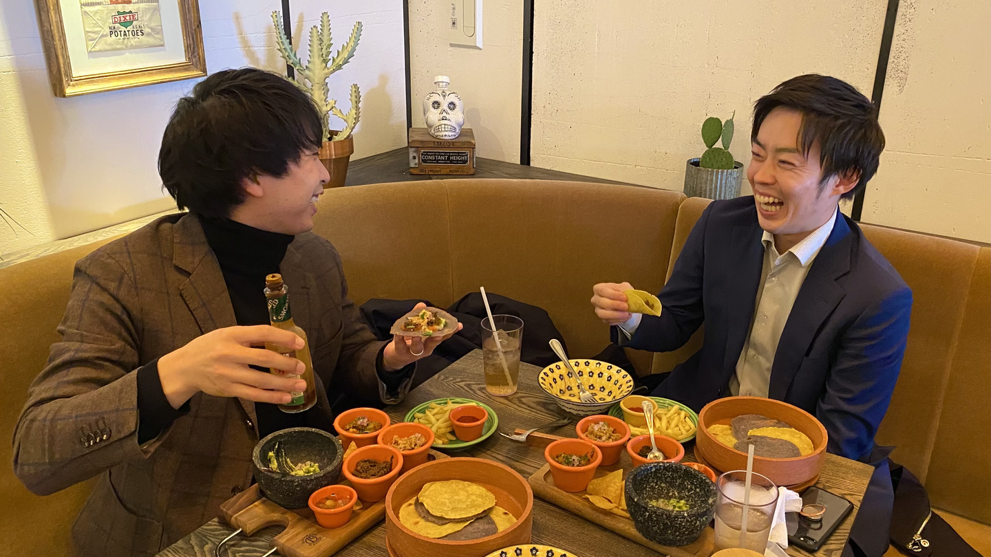 16卒6年目の浦田さん(ブラウンのスーツ)と、19卒3年目の間宮さん(ネイビーのスーツ)にご協力いただき、会社の近くのタコス屋さんに到着。