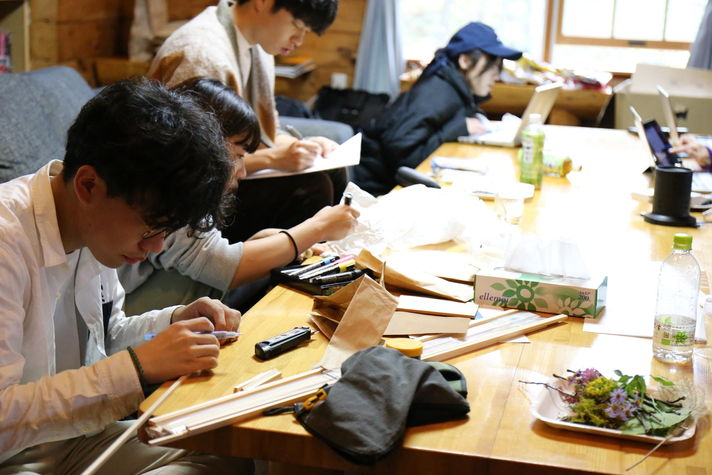 外で白馬の自然物を集めたり、中で道具を広げたりと、各自で作業を始めます。