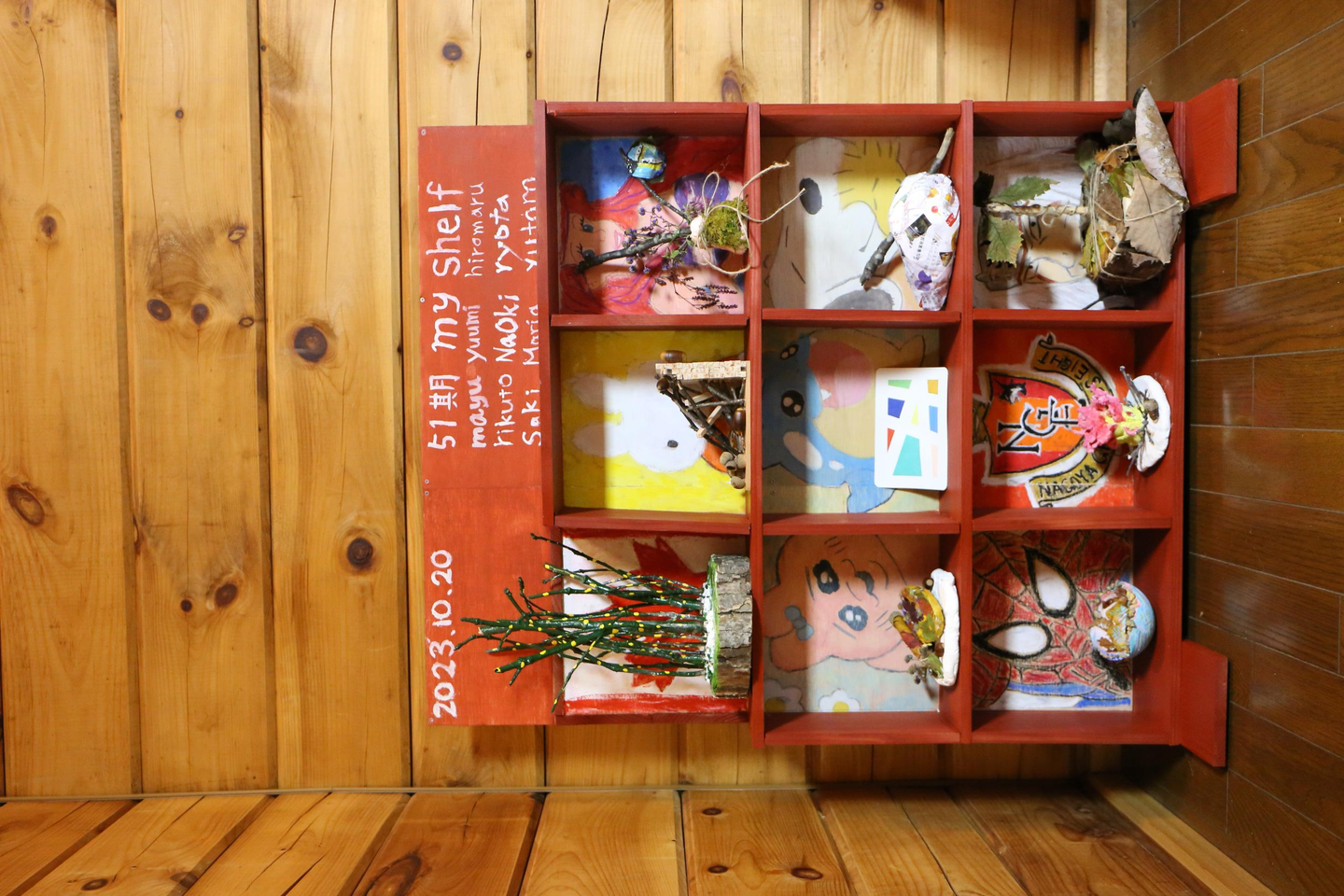 先輩方の作品は「my shelf」。1年目の好きなものを描いていただき、1年目一人ひとりの棚を作っていただきました…!