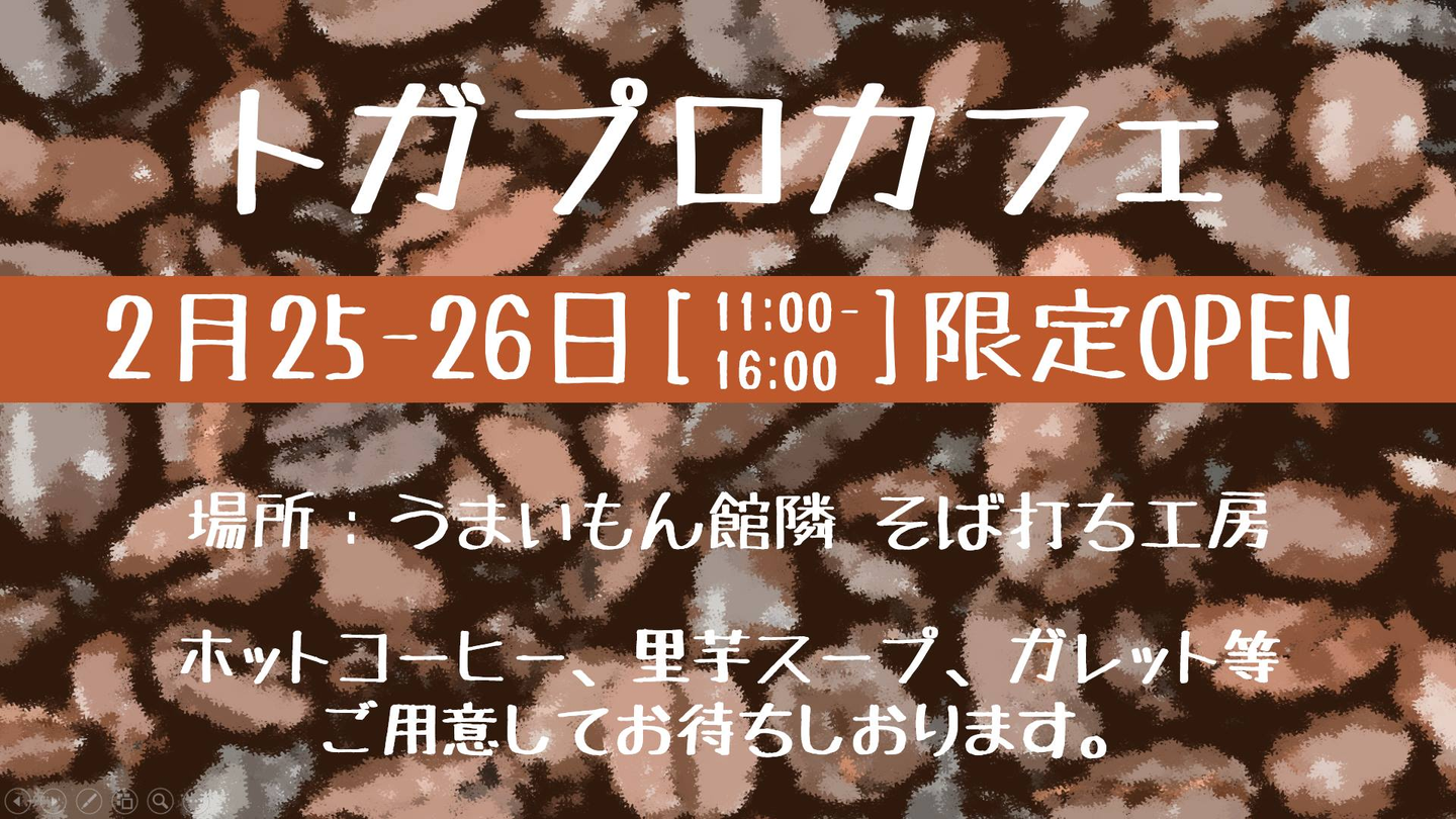 旧利賀スキー場の地滑りの影響でそば祭りが中止となり、利賀を元気付けようと発足したイベント「利賀元気市」の一貫として、トガプロでは、2月25.26日の11時から16時にうまいもん館の隣のそば打ち工房で「トガプロカフェ」を開きます!