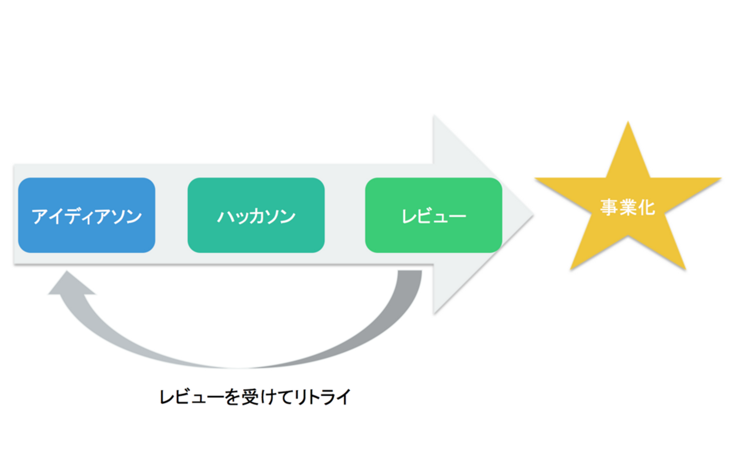 月1~2回でアイディアソン &ハッカソンを回して発表会を実施し、ビジネスモデル、プロダクトのUXの完成度が高いものに関しては正式にリリースを目指しての開発の許可及び本格的な予算、工数の割当が行われます。