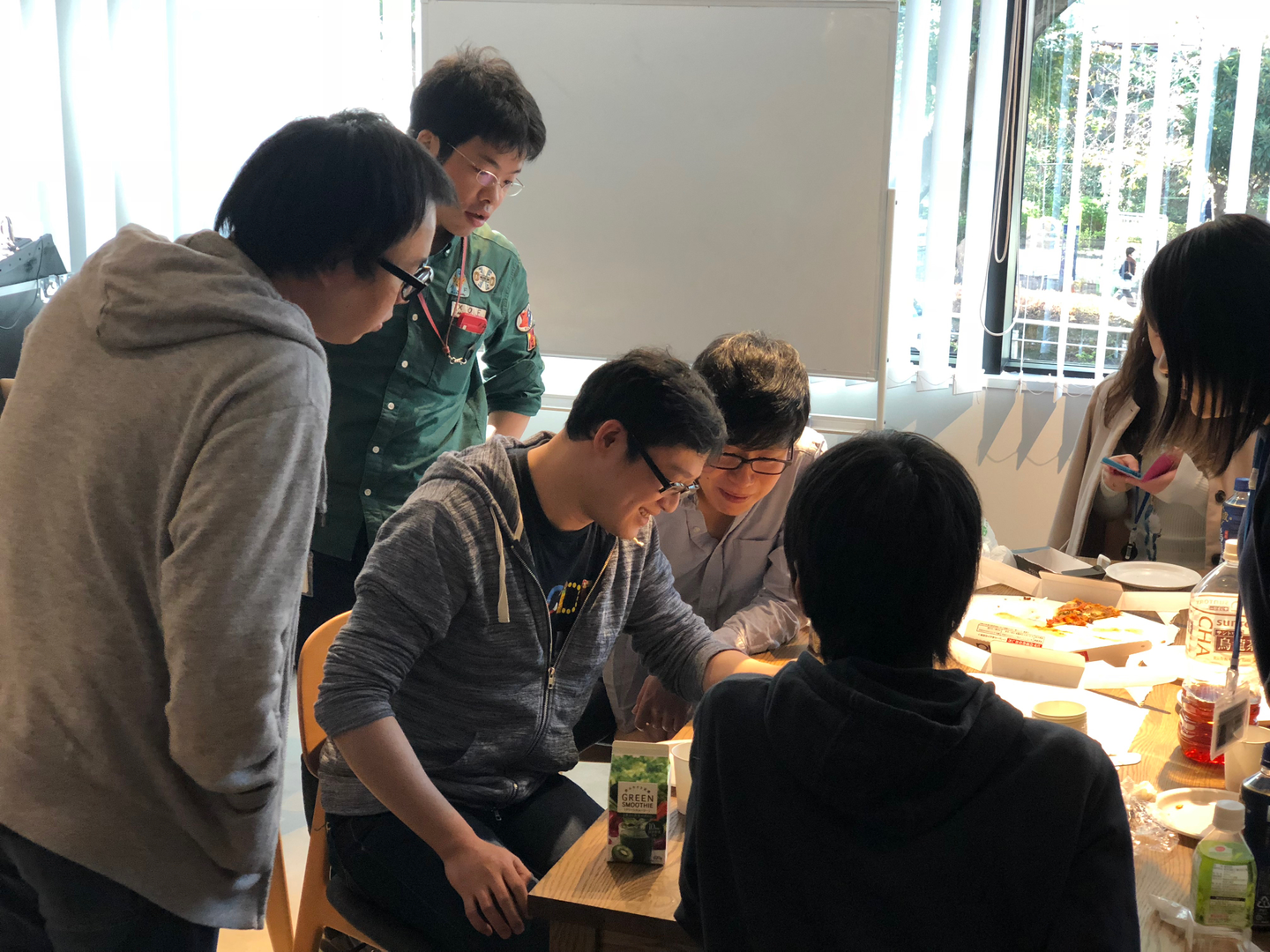 アイディアハッカソンではピザを食べながらそれぞれやりたいことを話し合い、発表し合ったり。