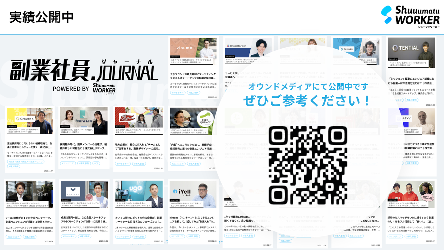 今後も「副業社員ジャーナル(https://shuuumatu-worker.jp/journal/)」では、副業人材の活用を通して、事業課題の解決・事業成長を実現した企業の声を記事にしていきたいと思います。副業についての情報発信なども、ぜひご覧ください!