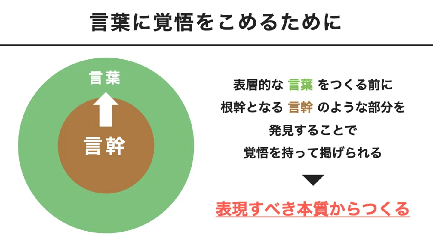・・といわれても、正直なところ難しいですよね。まずは言葉をつくる前に、言葉(葉)の手前にある、自分の中の中心の幹のような部分=言幹(ことみき)を見つける重要性を加来から説明します。