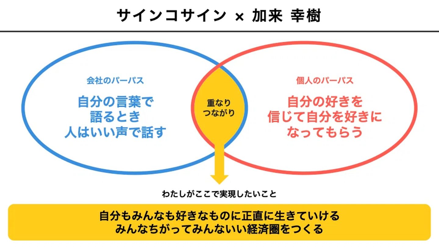 例:加来にとっての会社と個人のパーパスのつながりをもとにした今ここで実現したいこと