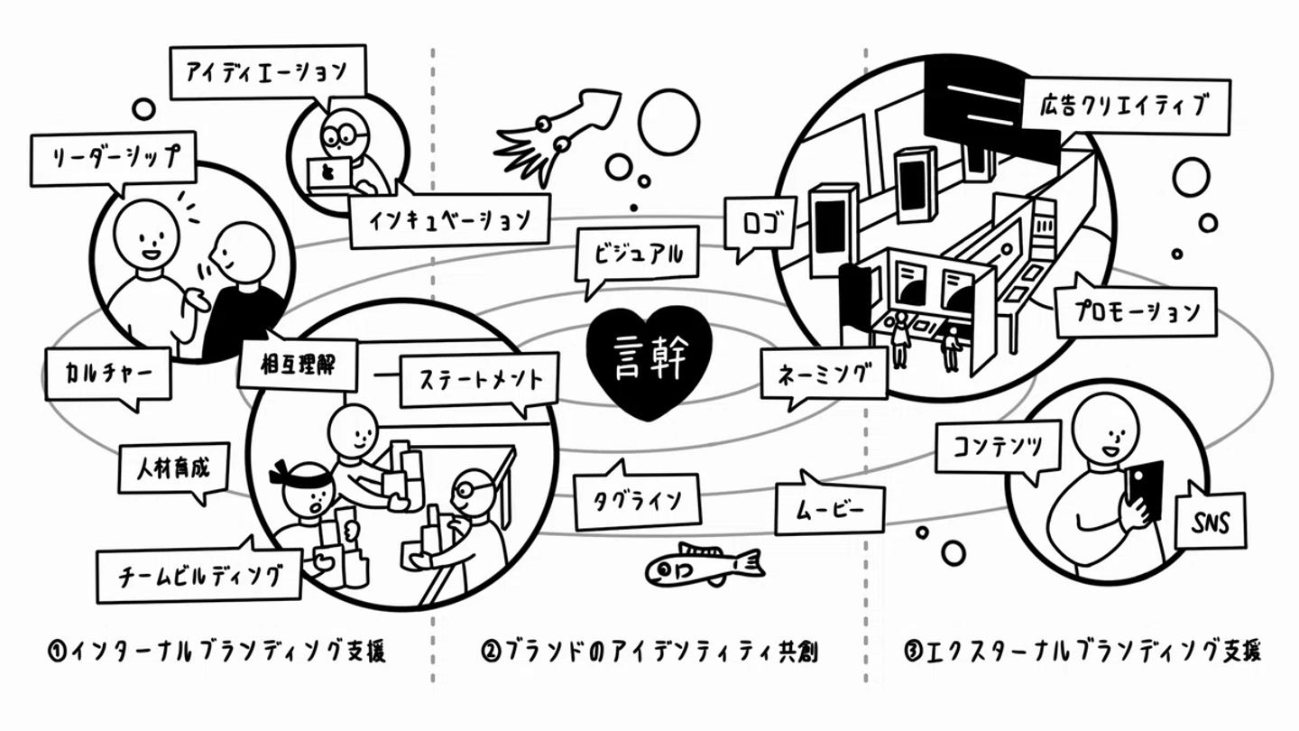 まずはその想いを「理念(MVVやタグラインなど)」として言葉を定義し、さらにその想いをひとりひとりのステークホルダーで共有しながら育んでいくために、私たちはキービジュアルやブランドムービーといったクリエイティブを制作します。