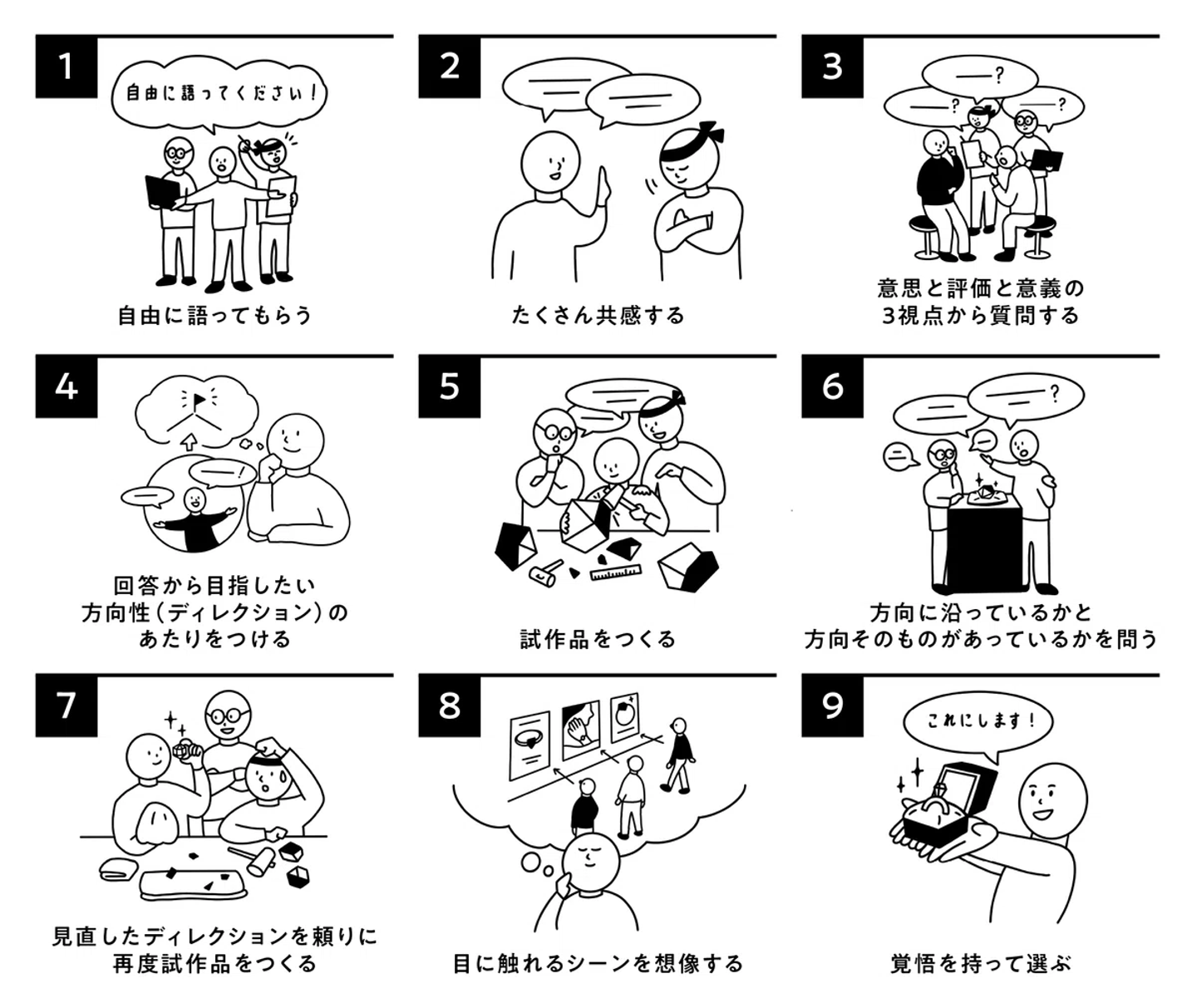 サインコサインのクリエイティブ共創フローは、ブランドアイデンティティとなる言葉の言語化とシームレスにつながっています。