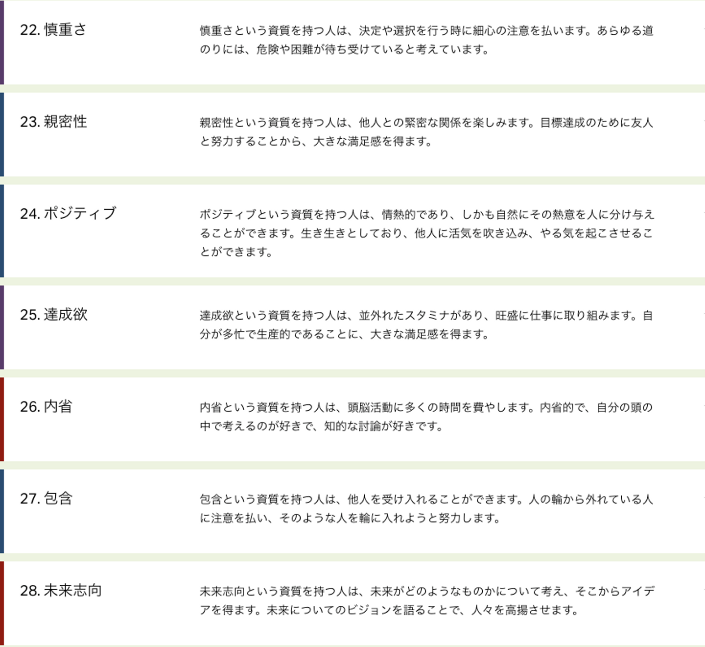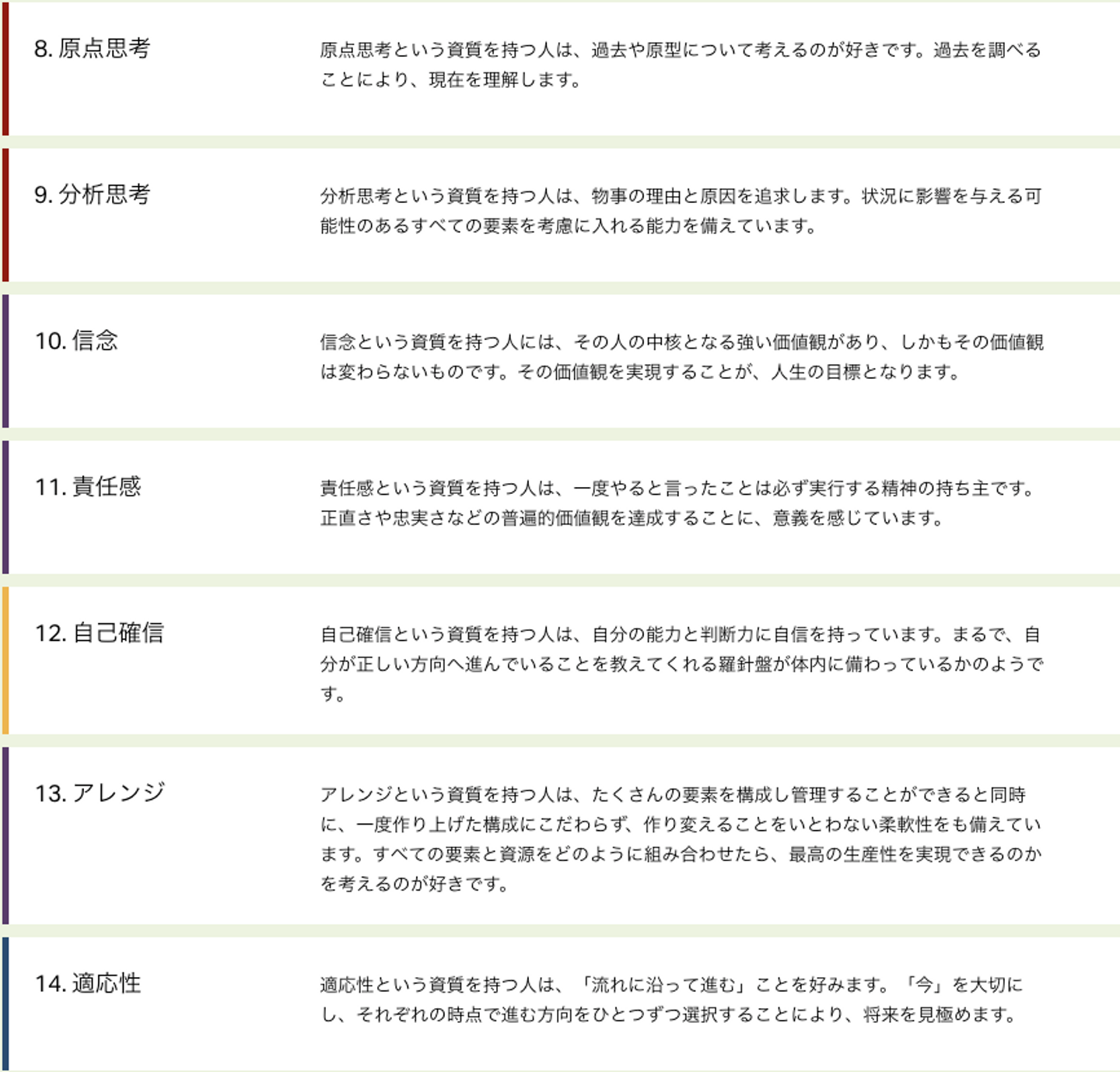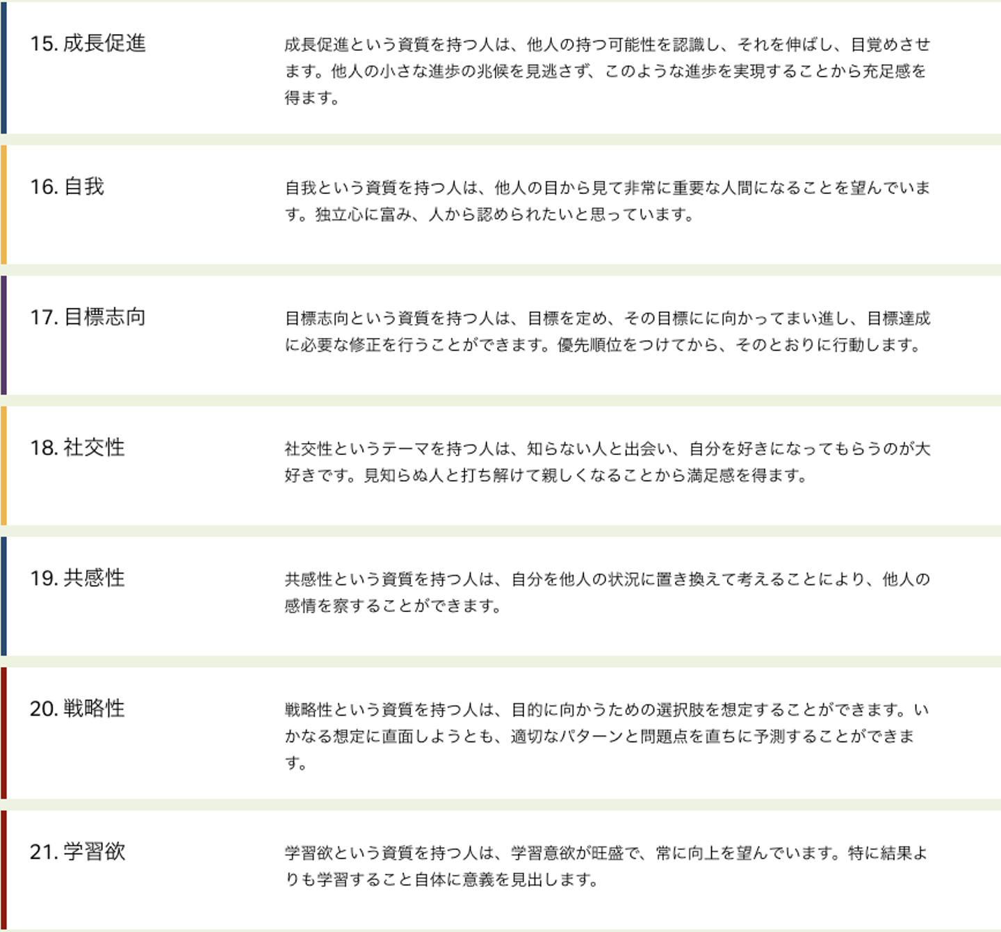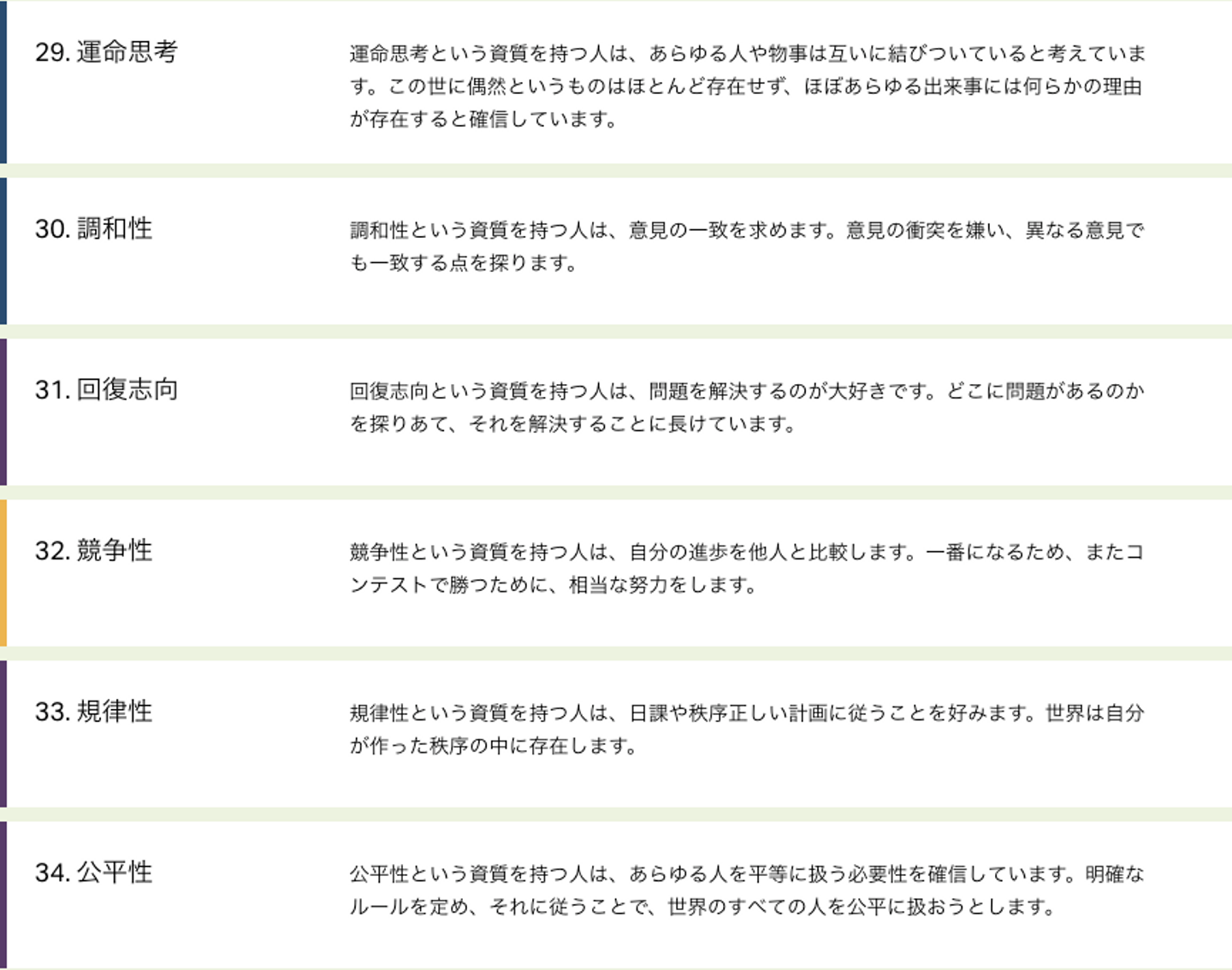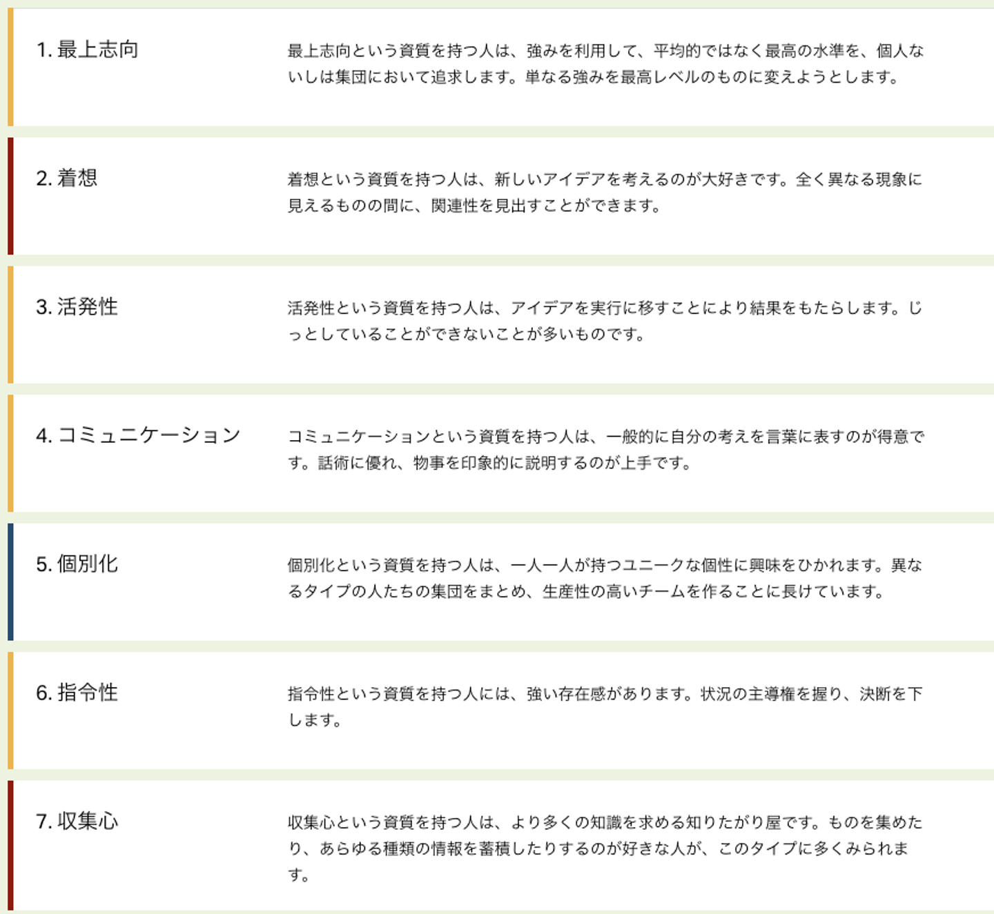 ストレングス・ファインダーはよくある適性検査というより、著名な経営者もよく実施している信頼度の高いものなので、未受験の方はやってみるとよいと思います。