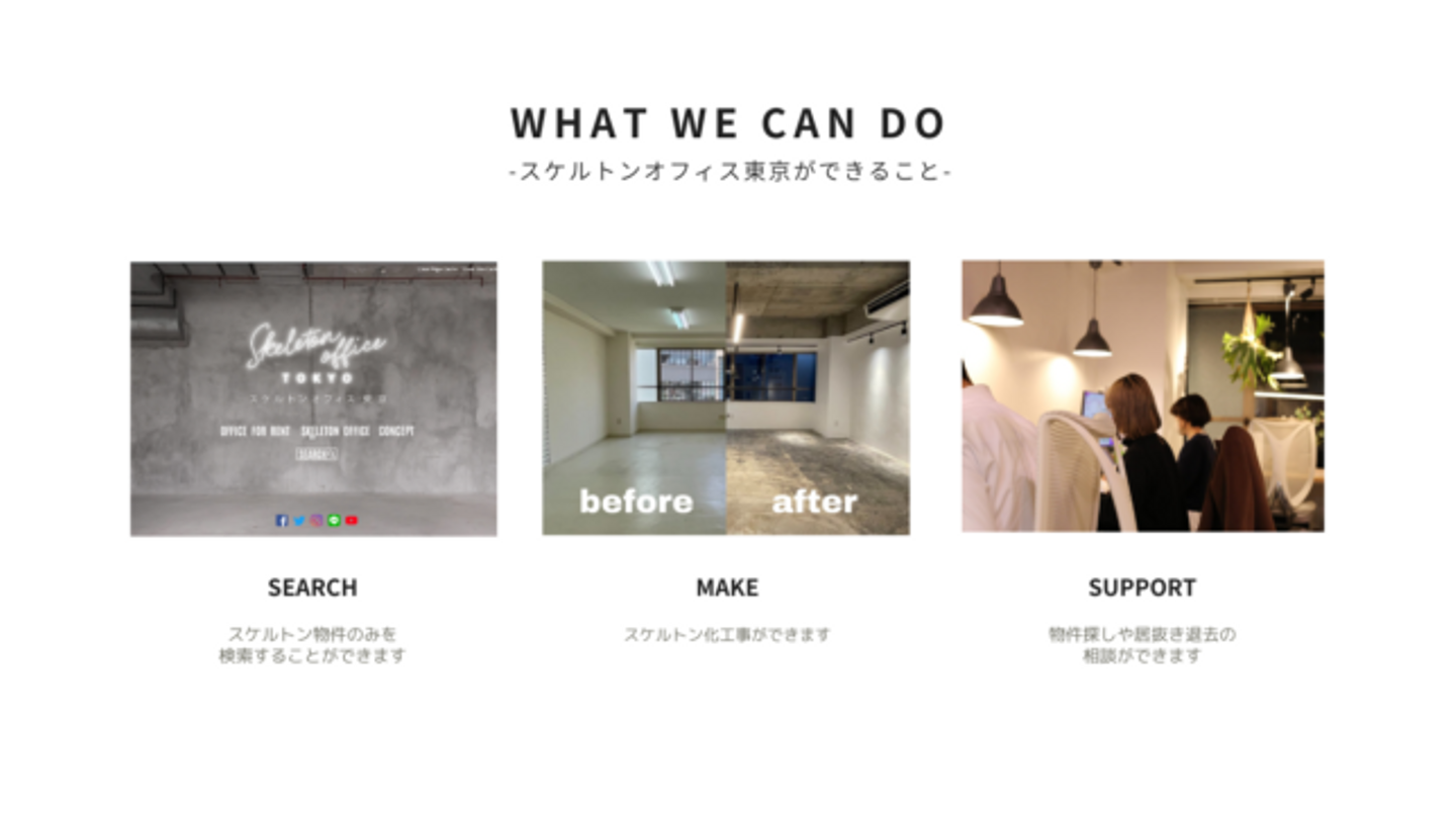 「スケルトンオフィス東京」は、スケルトン好きなスタッフが世の中にある物件情報の中から選りすぐりのスケルトンオフィス物件を探して、取材して掲載している賃貸オフィスセレクトサイトです。このサービスでは、無機質な空間に個人事業主、または企業のカラーに合わせた好きな家具、植物、アートを持ち込んでオフィス移転を実現することがコンセプトとされています。