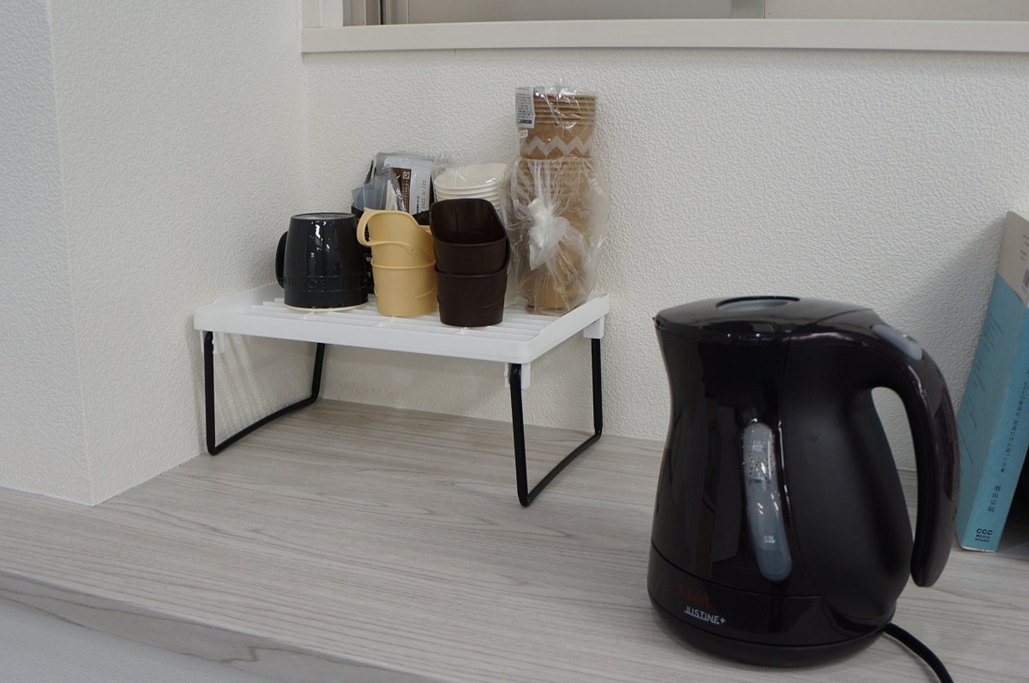 流し台と湯沸かしケトルもあります。コーヒーやカップラーメンを作りたいときは自由にどうぞ!