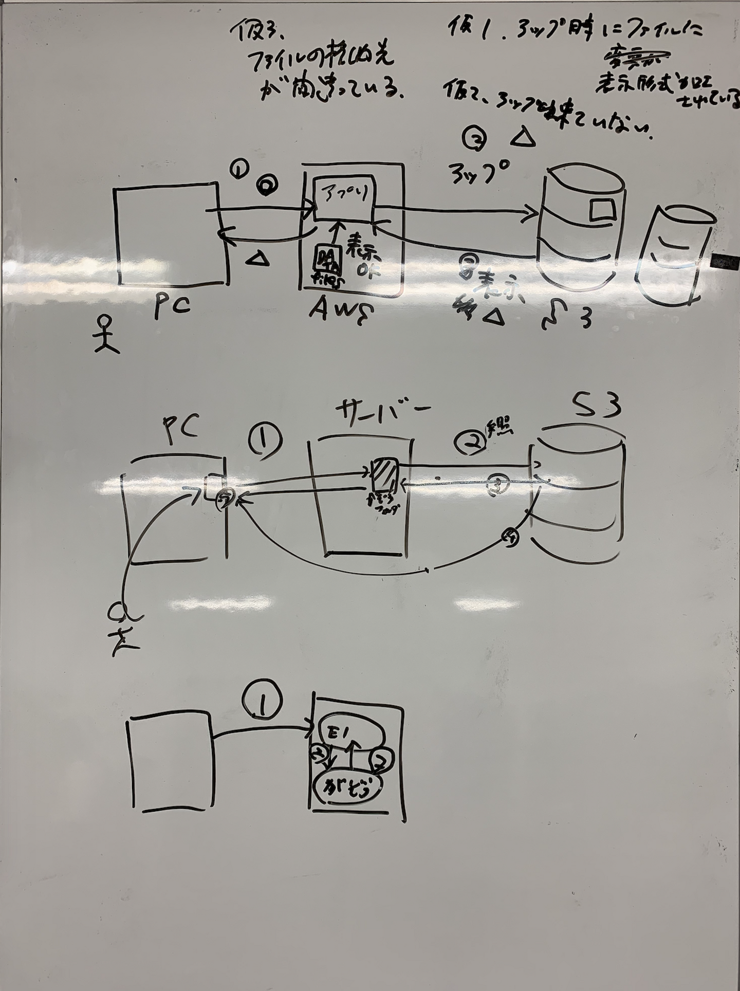 このエラーについて、ホワイトボードに処理の流れを実際に書き、それを元に