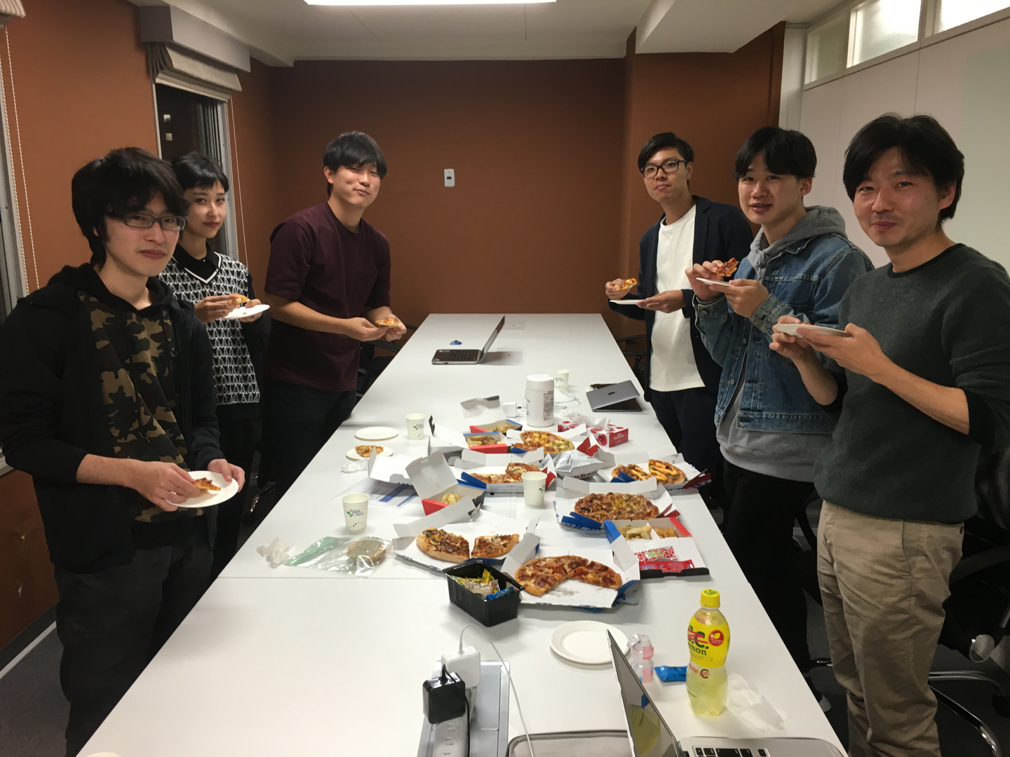 ピザをつつきながら、賑やかに談笑。筋トレの話などで盛り上がりました!