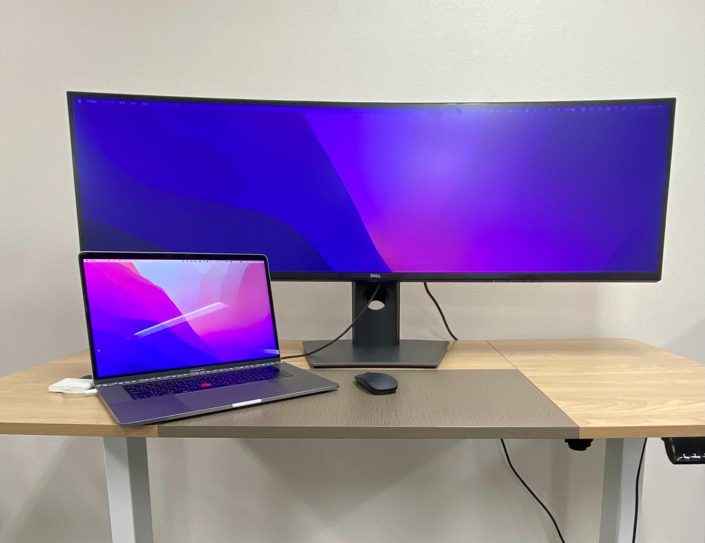 ▽ 49型ワイドモニター、MacBook、昇降デスク