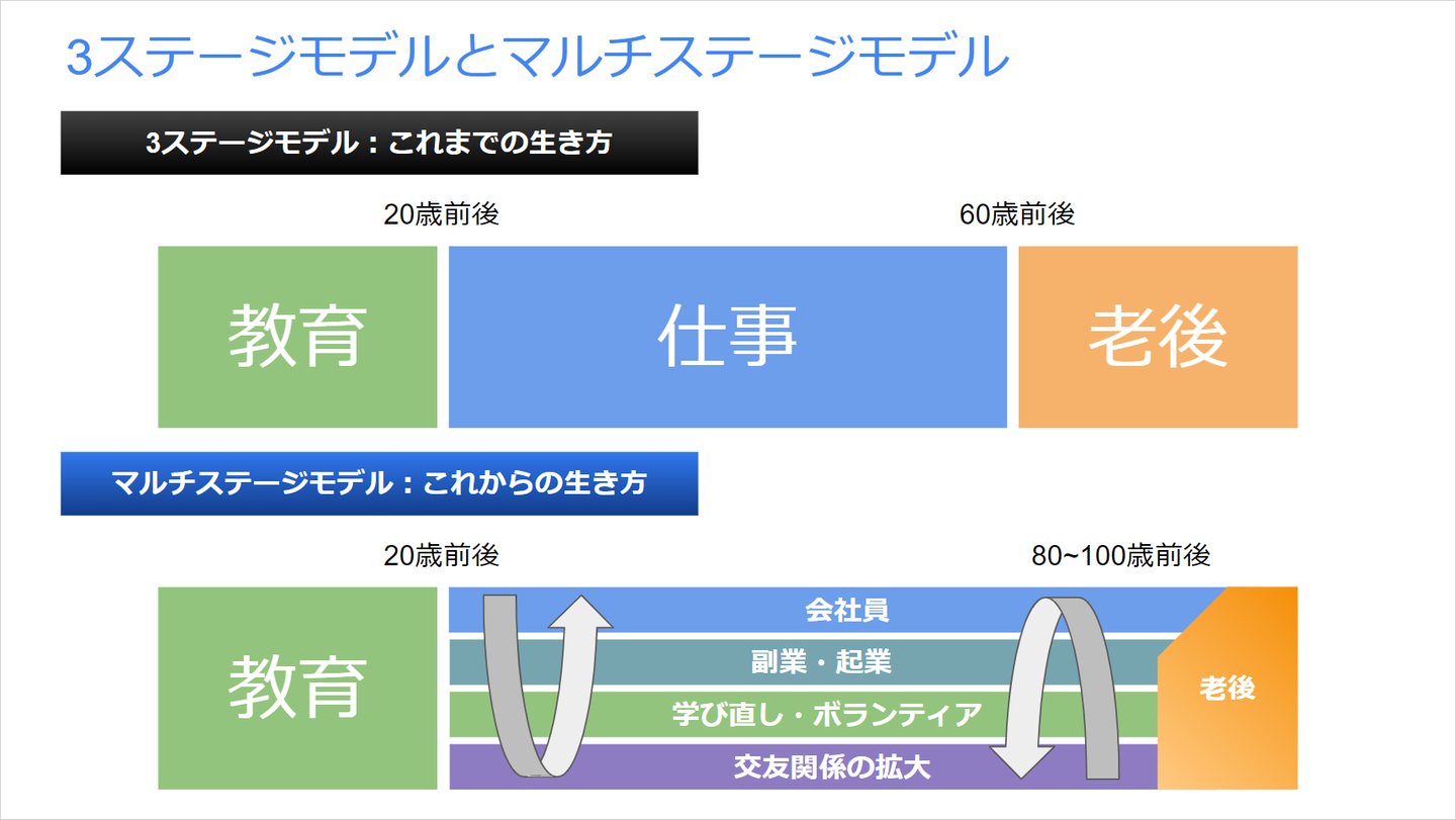 「教育→仕事→引退」という3ステージの生き方では、引退後の約40年間を経済的に支えられないですし、引退期間の不健康な期間が長くなるというのなら、未来に対してポジティブに考えることができないでしょう。