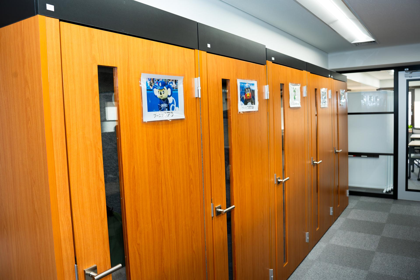 オンライン商談や会議の際に利用できる個室ブースを6つ設置。ブース名は「ドアラ」や「つば九郎」「ふっかちゃん」など、創業時からなぜかゆるキャラで統一されています(笑)。