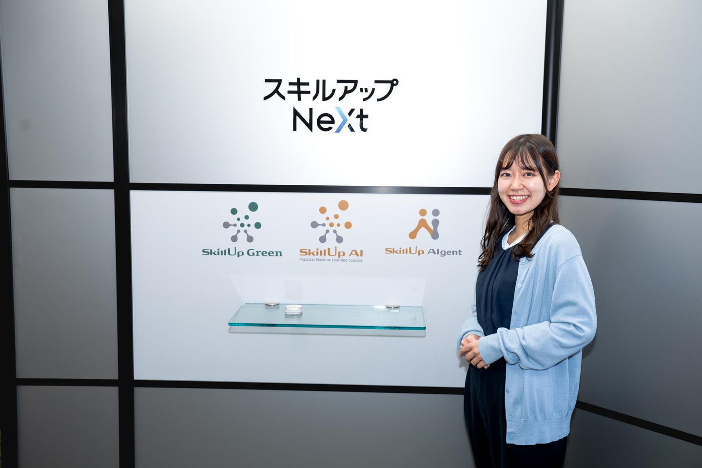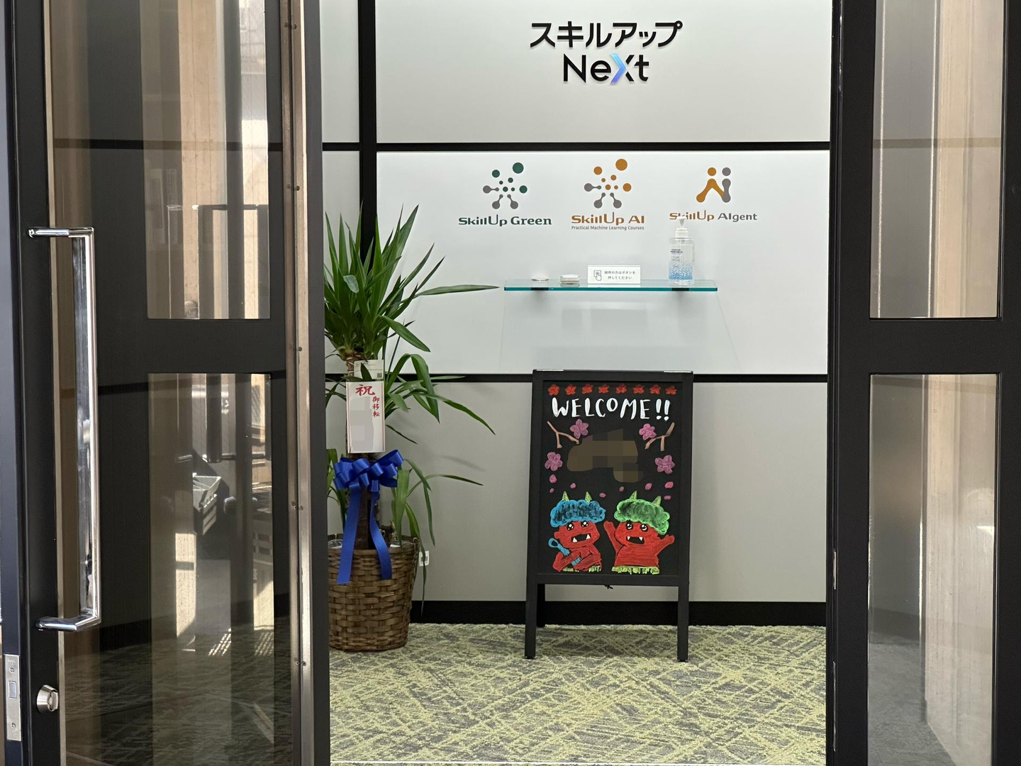 入り口には、スキルアップNeXtのロゴマークと主要サービスのロゴが描かれています。訪問時には、こちらのインターフォンを鳴らしてお呼びください。