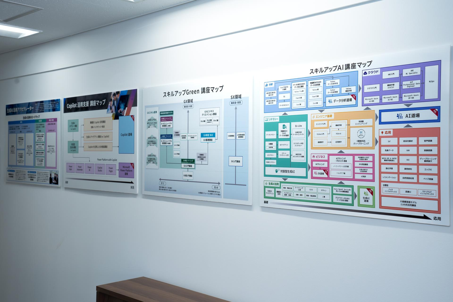 フロアの壁には、当社のサービス概要を掲示しています。お客様の来訪時に、お待ちいただく時に目に止めていただいたり、サービスについて説明できるようにしたり、工夫をしています。